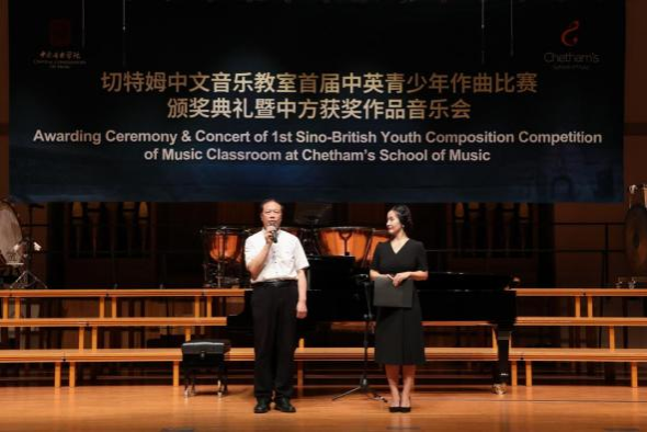 赵旻书记首先致辞,他表示:这次比赛体现了中英青少年作曲家对于美既不尽相同、又有异曲同工之处的理解与表达,充分证明了音乐是无国界的语言。陈欣若教授在致辞中介绍了本次比赛的评审规则,以及参赛具体情况。
