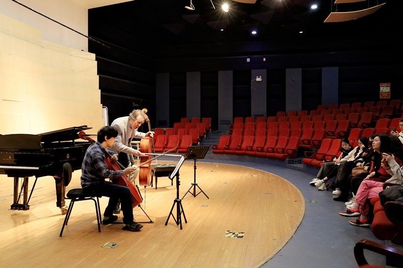 大师课现场,尼古拉斯·琼斯教授以诙谐幽默的授课风格,指导五位央音管弦系本科生——朱原玉婕、祝熙杰、鲍佳茵、张敬尧、姬儒涵,分别演奏了勃拉姆斯《e小调大提琴奏鸣曲》(第一乐章)、肖斯塔科维奇《大提琴协奏曲》(第二乐章)、德沃夏克《b小调大提琴协奏曲》、肖斯塔科维奇《第一大提琴协奏曲》(第三、四乐章)及舒曼《a小调大提琴协奏曲》(第二、三乐章),详细分析了每首作品的情感表达,并针对每位学生的不同演奏特点提出具体建议和指导。