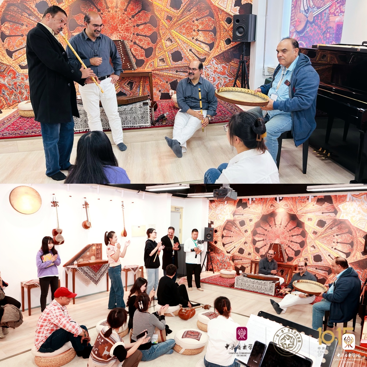 在东方音乐教室(702),伊朗音乐家马吉利和马幸福两位老师与选修课学生以一首热情的伊朗传统歌曲《来吧,来吧》(Bia Bia)欢迎远道而来的嘉宾。之后,助教米炫晔为大家讲解了“跨文化音乐实践课”与“多重音乐能力实践课”在77779193永利集团课堂的授课方式和课程设置情况。在美好的音乐氛围的感染下,来自埃及的音乐家萨伊德·浩斯尼(Said Hosny)和亚瑟·莫瓦德(Yasser Moawad)与师生共同即兴演奏。