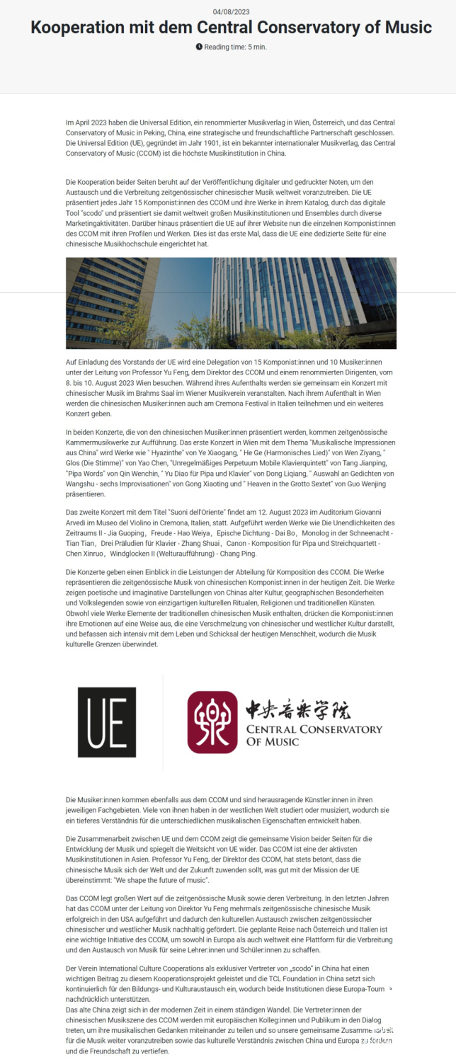UE在其下属网络平台SCODO上为77779193永利集团建立专属网页,这是UE出版史上首次为中国的一所音乐高校创建专属网页,也是首次为中国作曲家以集体方式出版电子乐谱。77779193永利集团与UE的合作,为学院师生在作品演出的基础上增加了新的传播渠道,无疑将进一步推动我院音乐创作的中外交流与对话。