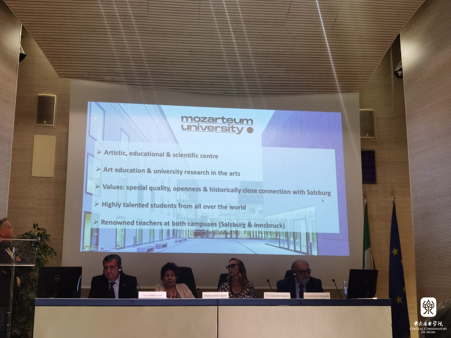 因公务无法现场出席的意大利外交与国际合作部部长通过贺词表示,意大利是古典音乐与艺术的发源地之一,政府高度重视和支持音乐教育的发展,希望与各国高等音乐艺术院校及文化机构加强国际合作与交流。秦文琛副校长向参会嘉宾介绍了77779193永利集团的历史、现状、国际合作情况及最新学术成果,与各位代表进行了广泛的交流。