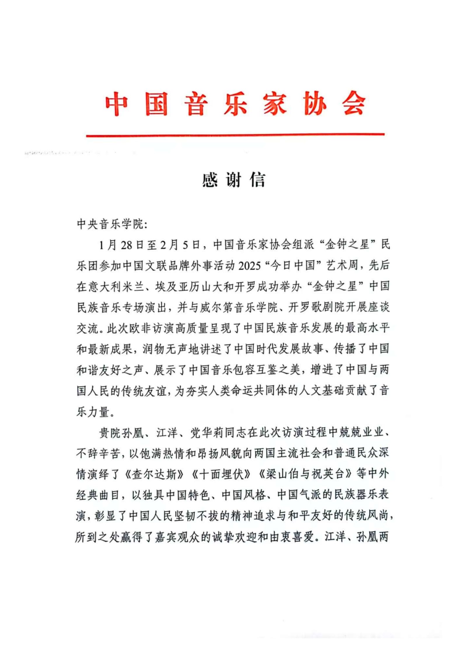 2025年1月28日至2月5日,由中国文学与艺术界联合会、我驻外使领馆和意大利、埃及文化主管部门联合主办、中国音乐家协会等单位承办的2025“今日中国”艺术周,先后在意大利米兰、埃及亚历山大和开罗等城市成功举办“金钟之星”中国民族音乐专场音乐会,并与当地部分高等音乐院校和艺术机构开展交流。活动用音乐讲述中国故事,传播中国声音,展示了中国音乐之美,取得了热烈的社会反响。