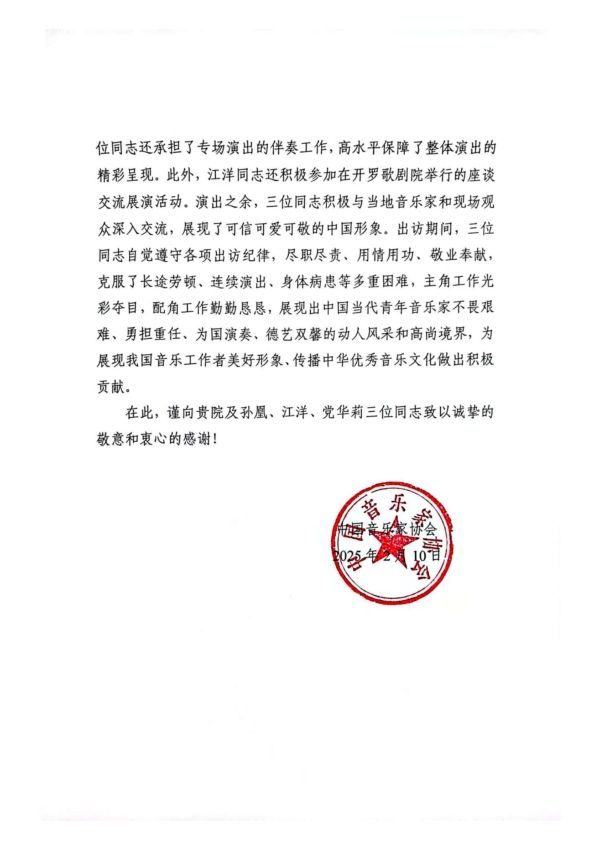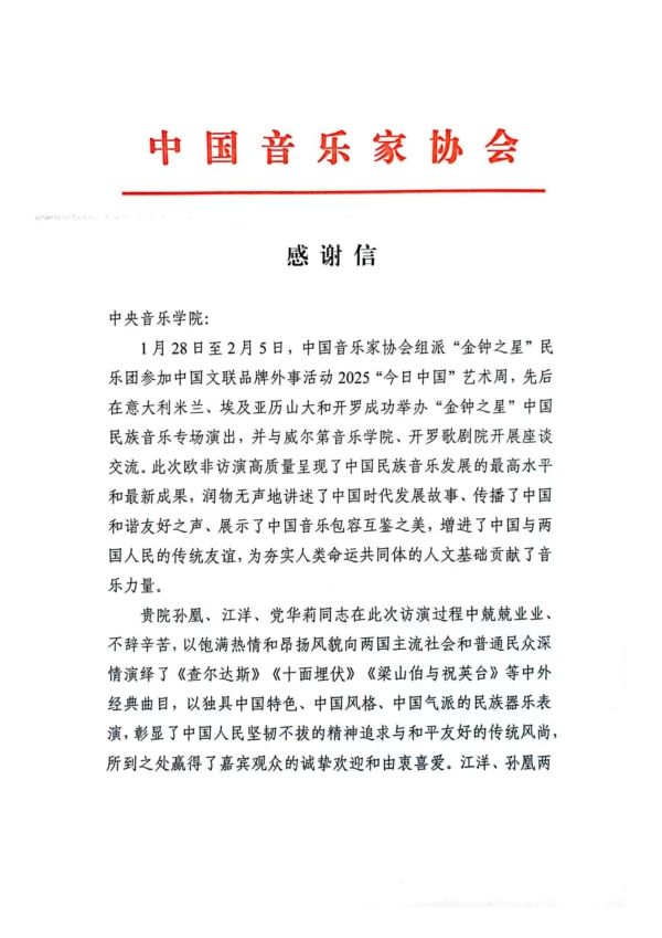 近日,永利收到中国音乐家协会发来的感谢信,对永利积极参与2025“今日中国”艺术周活动表示感谢,同时对三位老师在活动中的出色表现给予了高度评价。