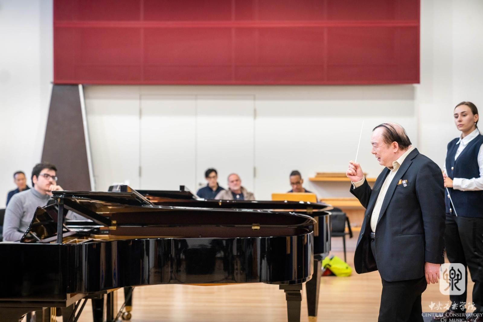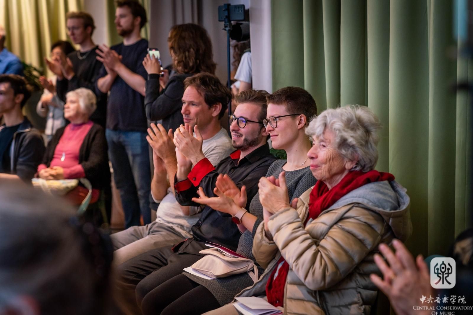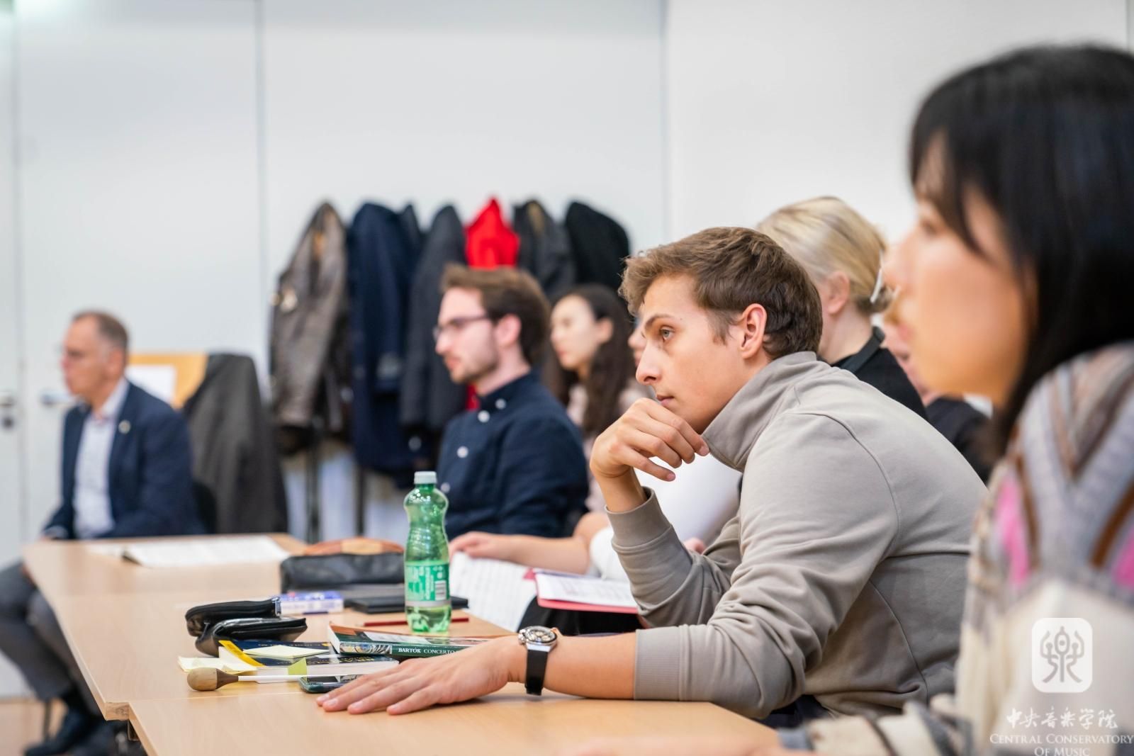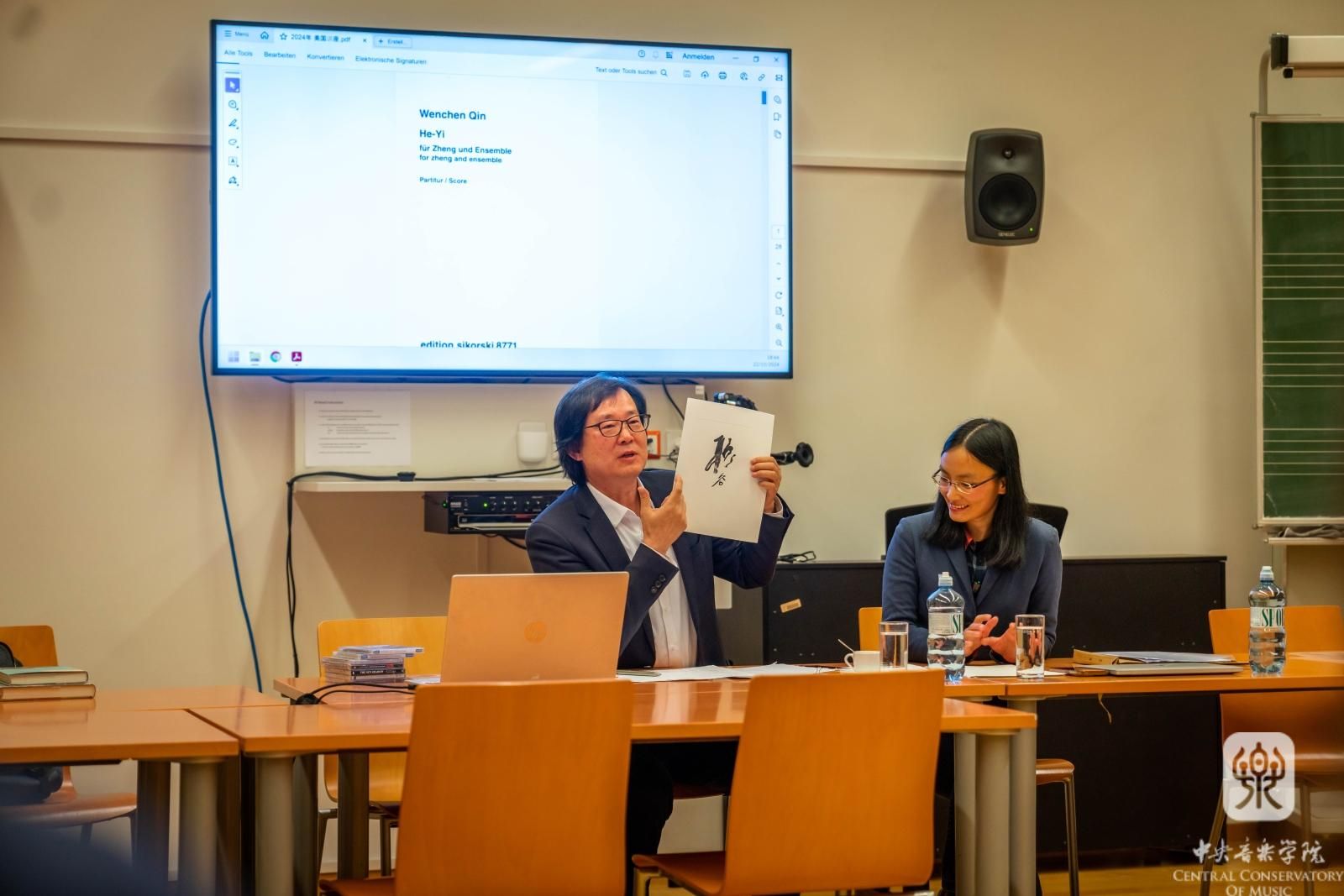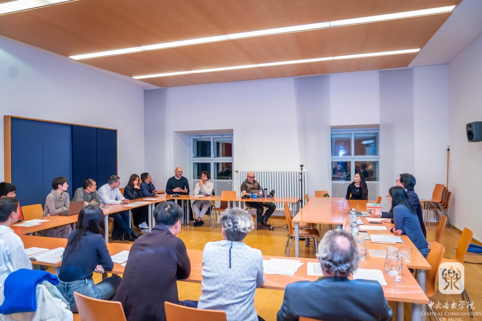 当天下午,俞峰教授指挥大师班与秦文琛教授作曲讲座如期举行。从下午二时开始的指挥大师班持续了3个多小时,俞峰教授对维也纳国立音乐与表演艺术大学的6名指挥专业学生依次作了精心的指导。俞峰教授以讲解、示范相结合的方式,从音乐作品的处理、指挥技术的运用、指挥家的角色作用等方面做了理论和实践的教学,并在大师班结束后,耐心地一一回答了学生们的提问。秦文琛教授的讲座面向作曲系师生,他结合自身的学习、创作经历,以近年创作的《太阳的影子III》《山际线》《听谷》等作品,讲述了中国文化和自然风物对其的影响,并讨论当代音乐创作实践与教学的相关问题。