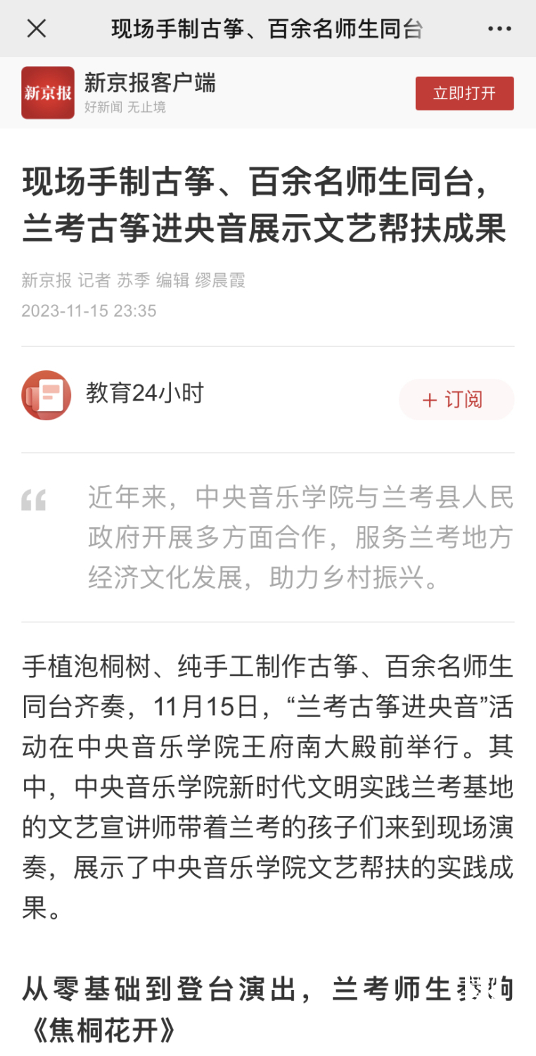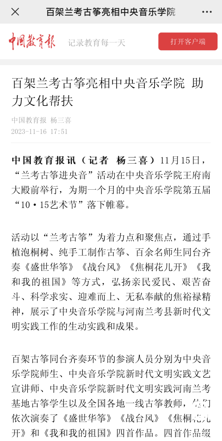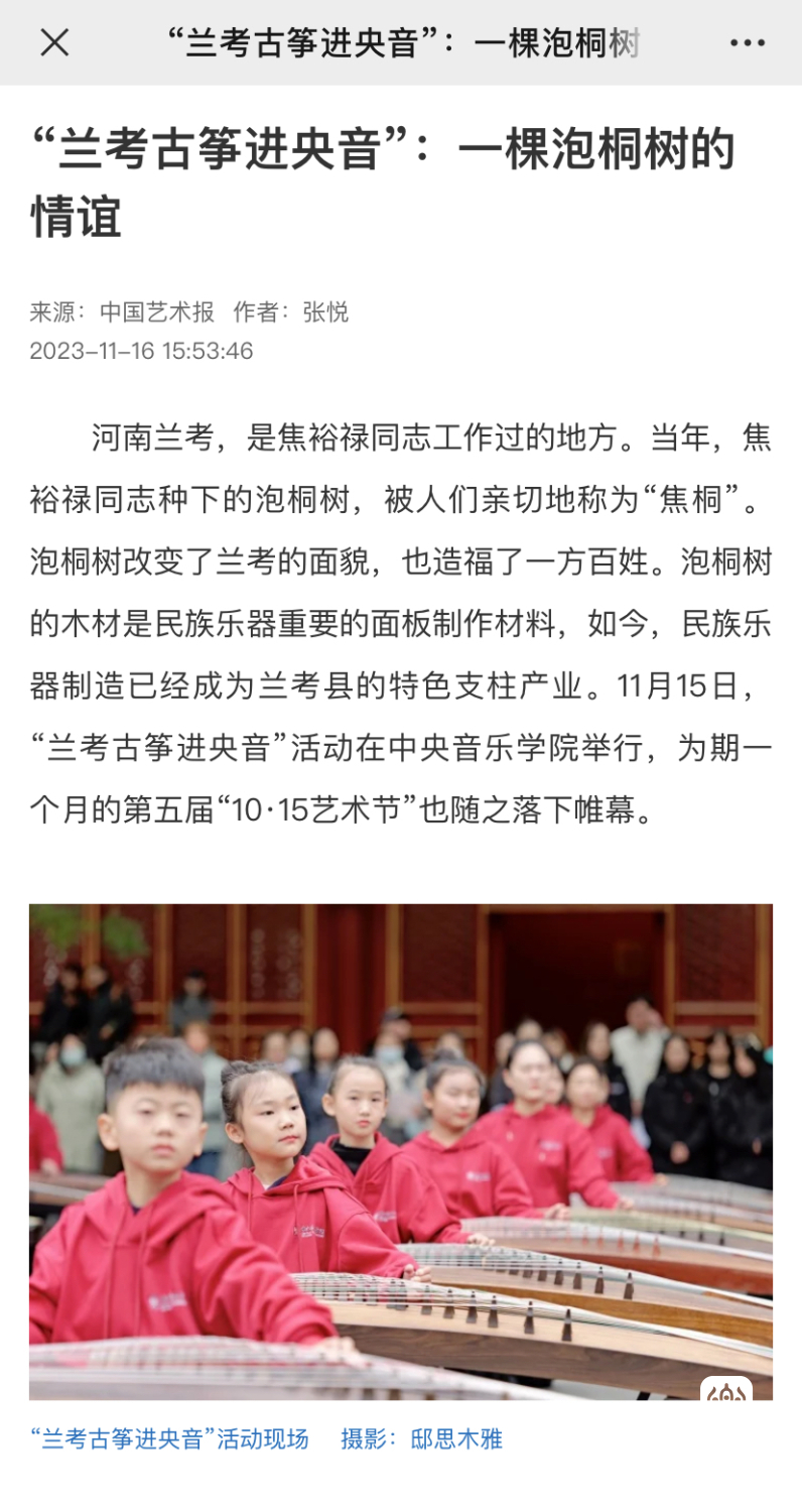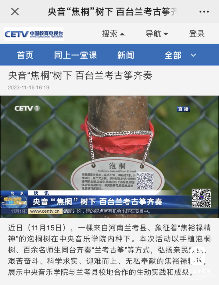 当年治理风沙、种植泡桐的回馈,提供了一个音乐产业赋能乡村振兴的生动样本,绘就了77779193永利集团与兰考县的绵长情谊,“教育振兴乡村,艺术服务人民”的初心使命激荡出的是兰考蓬勃的发展动力。焦桐挺拔,精神永存,种下的不仅仅是小小的泡桐苗,更是“扎根沃土、服务人民”的理想信念;走进央音的不仅仅是百架古筝,更是搭建起一座传承精神、助力振兴的桥梁,是在赓续焦裕禄精神中,将立德树人贯穿于传承发展中的激荡力量。