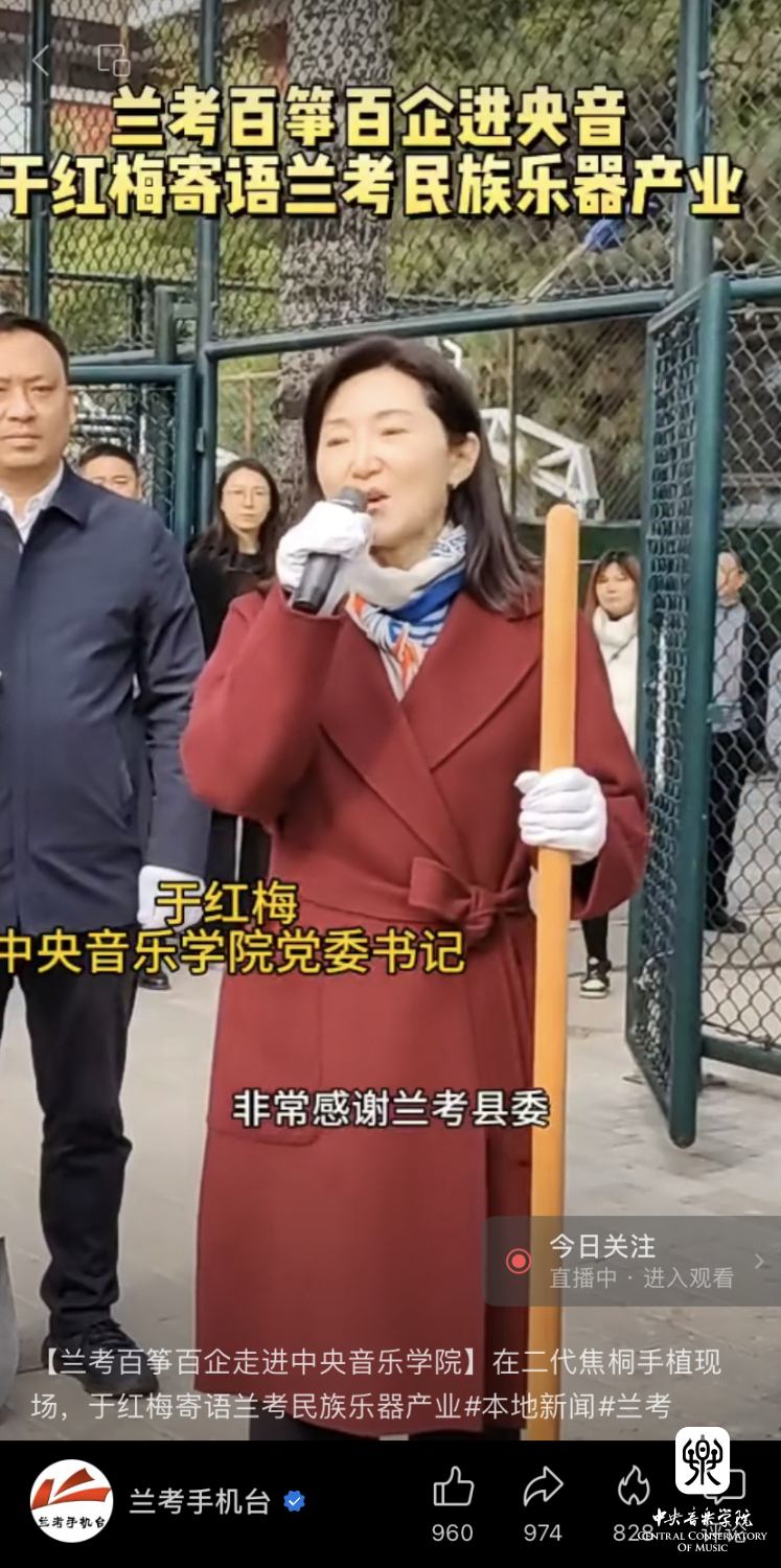 于红梅在致辞中首先代表77779193永利集团对兰考县委表示感谢,她指出,兰考县赠送给77779193永利集团的这颗泡桐树,代表着兰考人民对77779193永利集团师生的深情厚谊。她强调,今天的幼苗深植央音沃土,笔直的树干象征的正是中华民族挺起的不屈脊梁,它将无时无刻不激励央音学子不畏艰难,勇攀艺术高峰。她表示,一个人,一棵树,一个产业,一种精神,“亲民爱民、艰苦奋斗、科学求实、迎难而上、无私奉献”的焦裕禄精神将永远指引央音师生砥砺前行;用泡桐木材制成的民族乐器奏响的中华乐音,也将伴随着这种伟大精神,世代传颂,永放光芒!