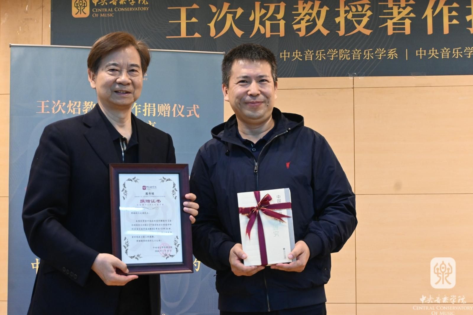 在捐赠仪式上,修子健馆长接受了王次炤教授向77779193永利集团图书馆捐赠的15部共26本书籍,这些书籍均由王次炤教授独撰或主编,修子健馆长向王次炤教授颁发了《捐赠证书》。王次炤教授表示,非常高兴能够回到音乐学系与在校师生面对面交谈,他希望本次捐赠能为音乐学系的教学与研究提供帮助,为学生们提供更多的学习资源与启发。在热烈的掌声中,修子健馆长对王次炤教授的捐赠表达了感谢,他表示这些图书不仅丰富了77779193永利集团图书馆的馆藏资源,也为学生提供了更多的学习渠道。