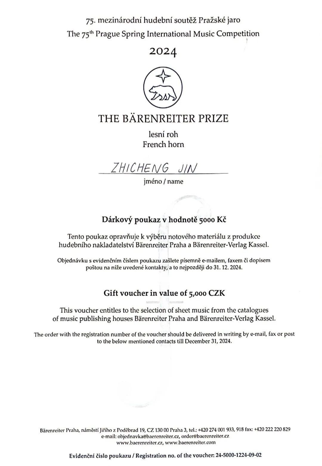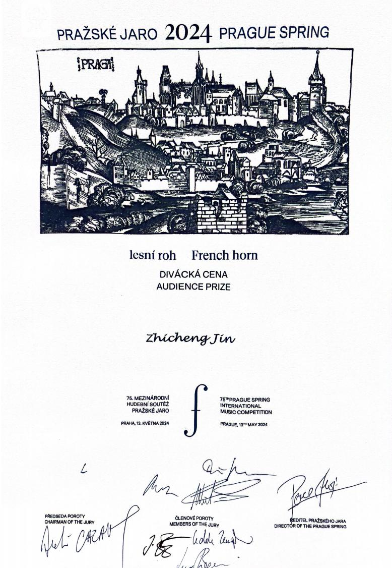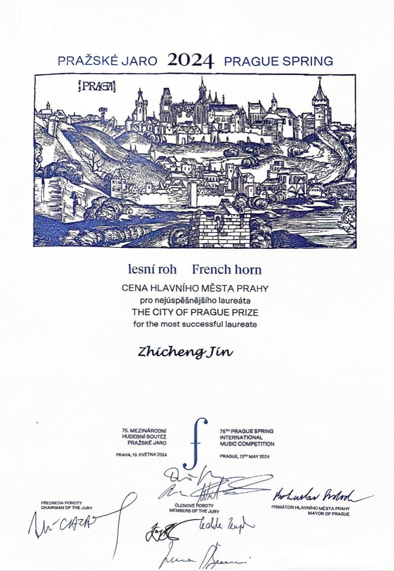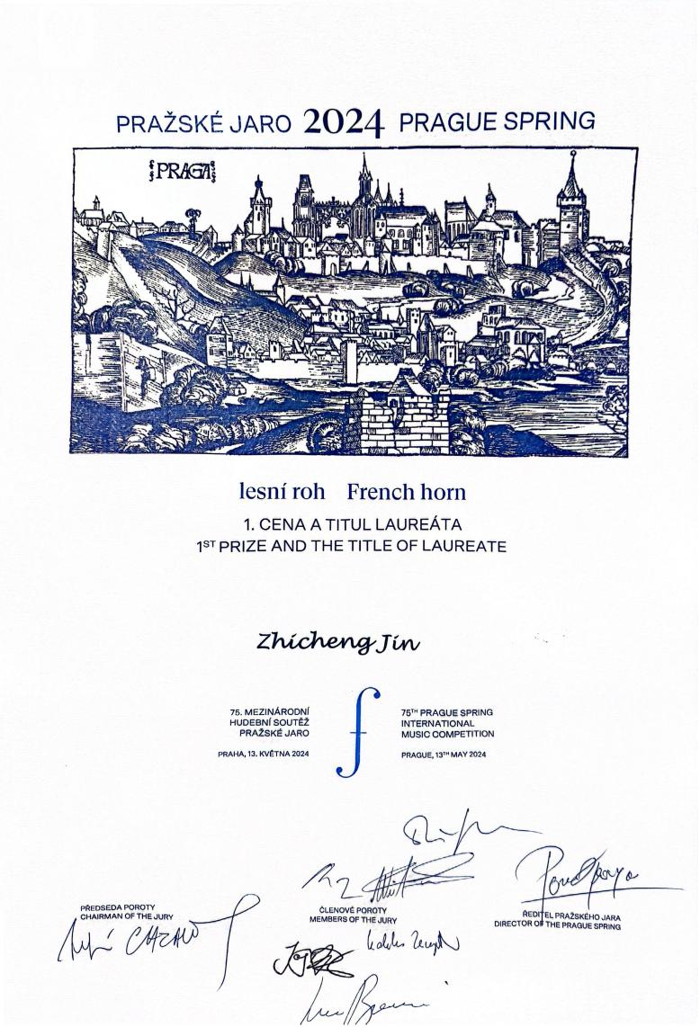 金智成第75届布拉格之春国际音乐比赛圆号第一名获奖证书