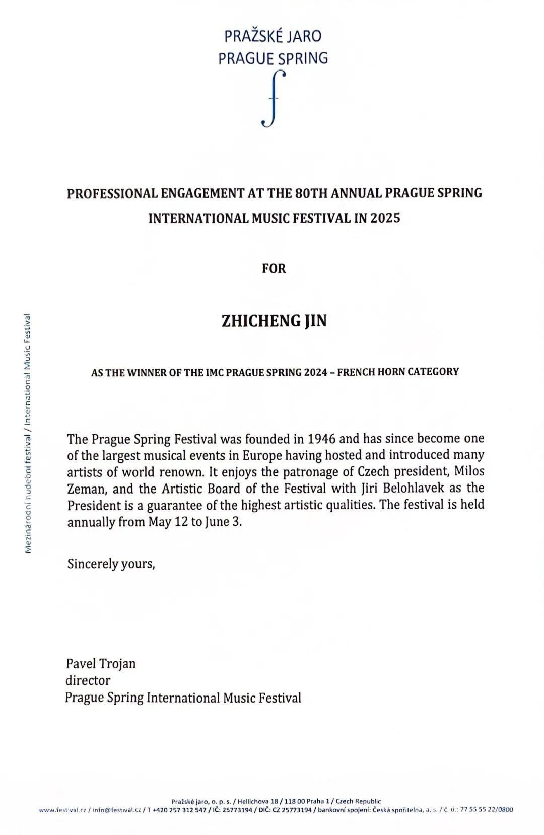 受邀参加2025年第80届布拉格之春国际音乐节的演出