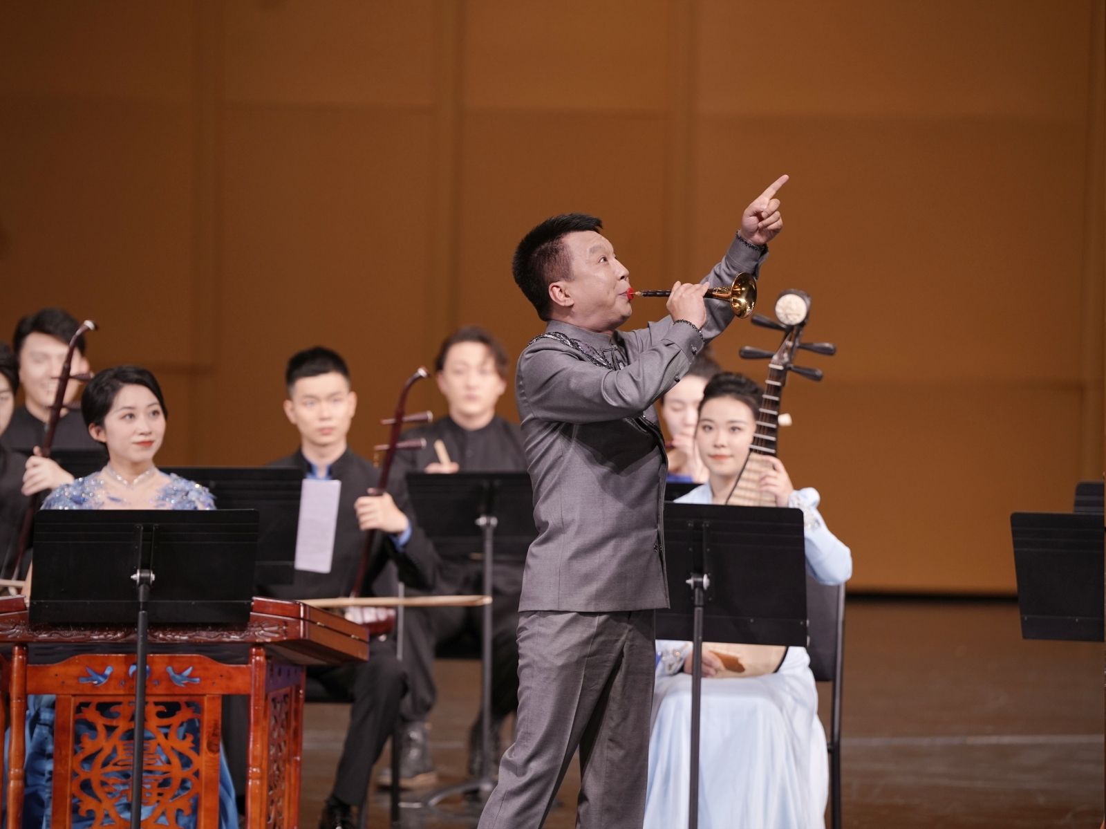 随着唢呐吹出的一声长音,迎来了“乐咏中华”的又一个高潮,唢呐演奏家、永利民乐系党总支书记石海彬教授,携手民乐系小乐队带来的经典作品《百鸟朝凤》通过音乐情绪的起伏变化,描绘了“箫韶九成,凤凰来仪。梧桐生矣,于彼朝阳!”的景象。石海彬精湛华丽的技巧不断将音乐推向高潮,唢呐的华彩乐段更是将欢腾的情绪推到顶点。