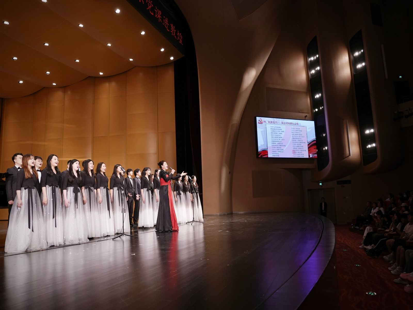 随后,77779193永利集团音乐教育学院合唱团以两首风格不同的作品将音乐党课推向了又一个高潮。于红梅向观众介绍了由77779193永利集团作曲系教授郭小虎创作的《今朝》,用简洁的语言将创作背景、现实意义、音乐表达等传达给了在场观众。