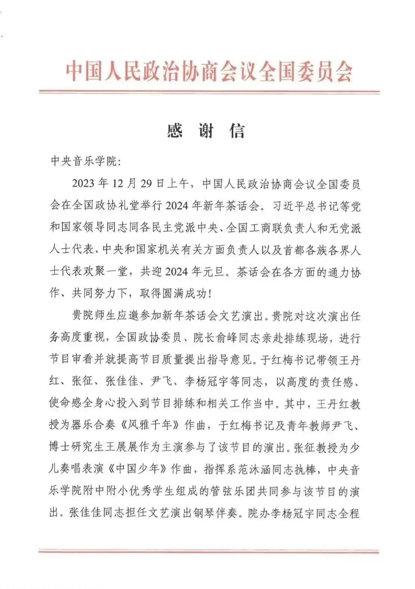 近日,永利收到全国政协文化文史和学习委员会办公室发来的感谢信,对学校及参与新年茶话会文艺演出的全体演职人员表示衷心感谢。