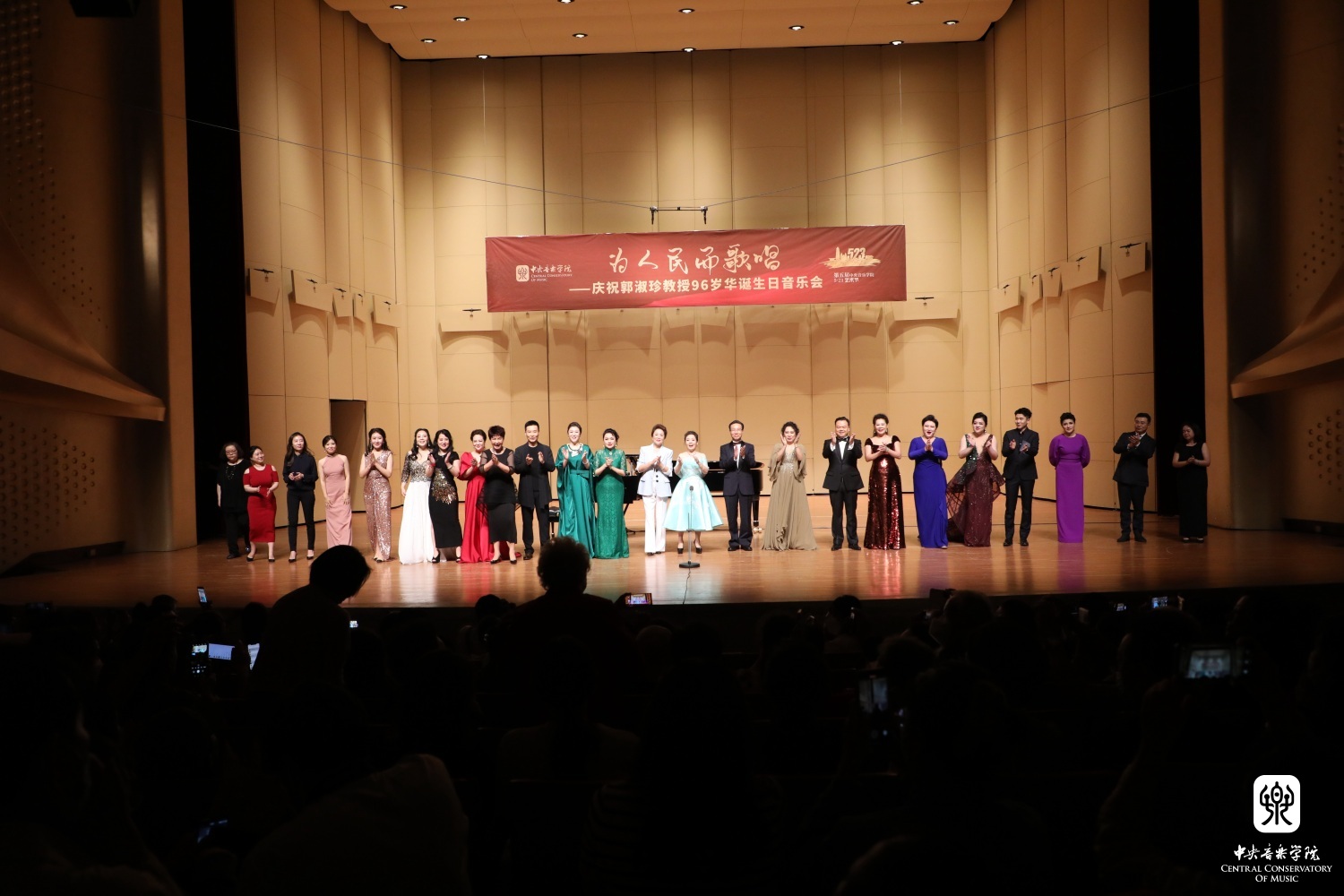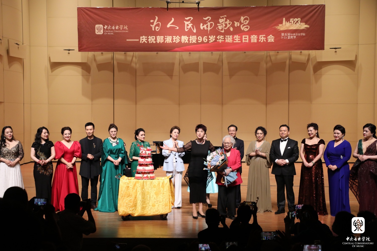 歌短情长,师恩难忘。音乐会结束后,台上台下共同为兔年出生的郭淑珍教授唱响《生日快乐歌》。在现场热烈的气氛中,身着桃红色上衣的郭淑珍教授欣然从观众席走上舞台,与全体演员和观众们一起高唱《我和我的祖国》。郭淑珍教授一生为国家育才,为人民歌唱,她的心永远和祖国紧密相连。