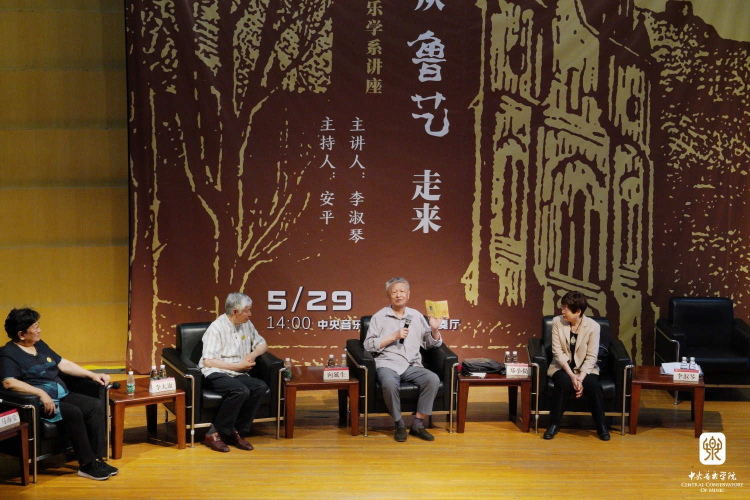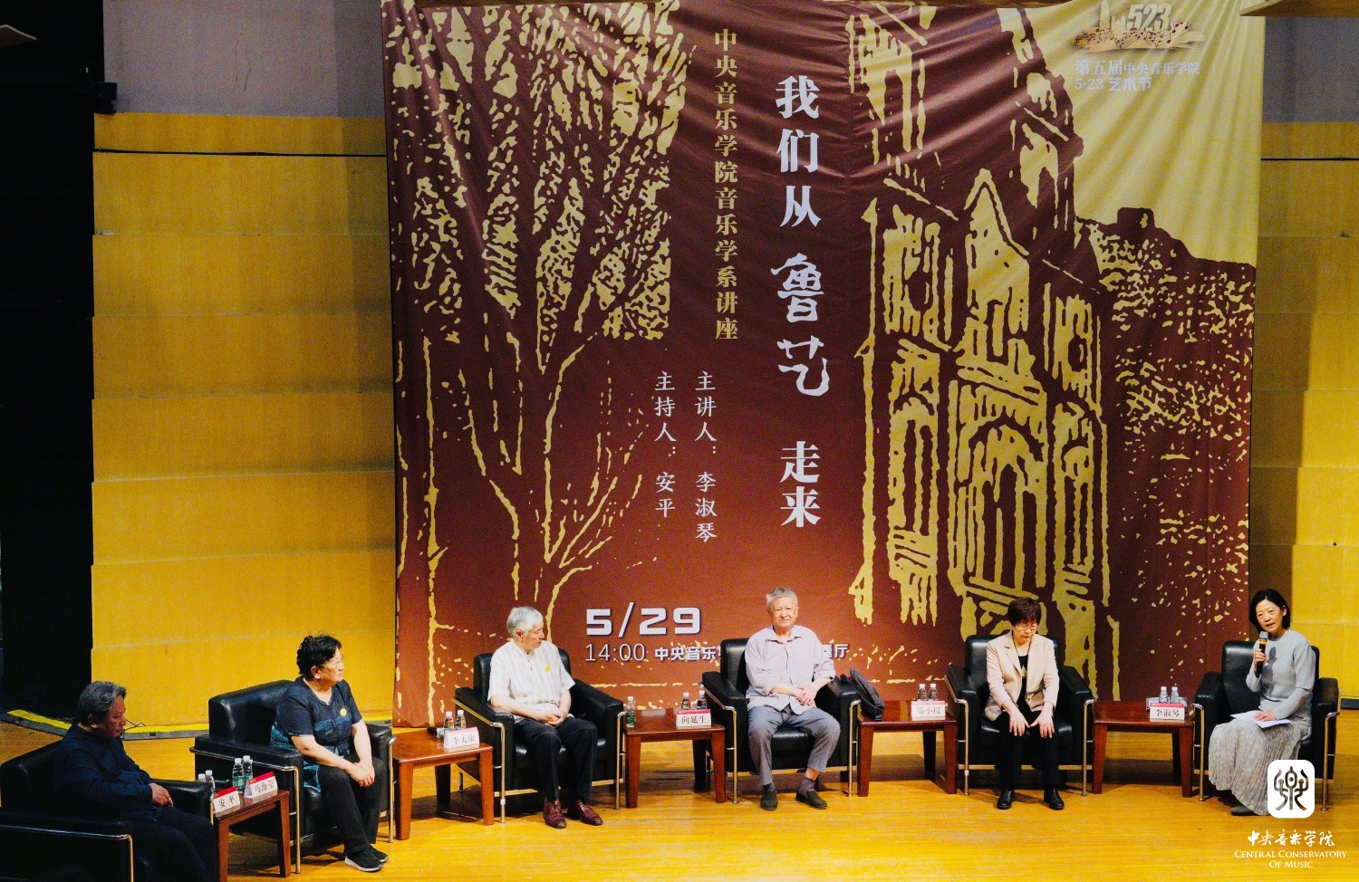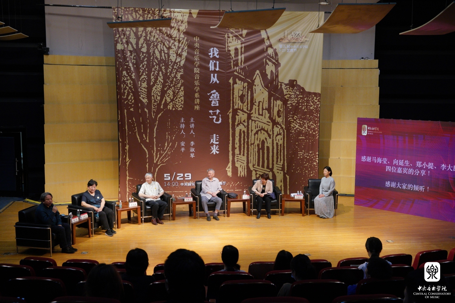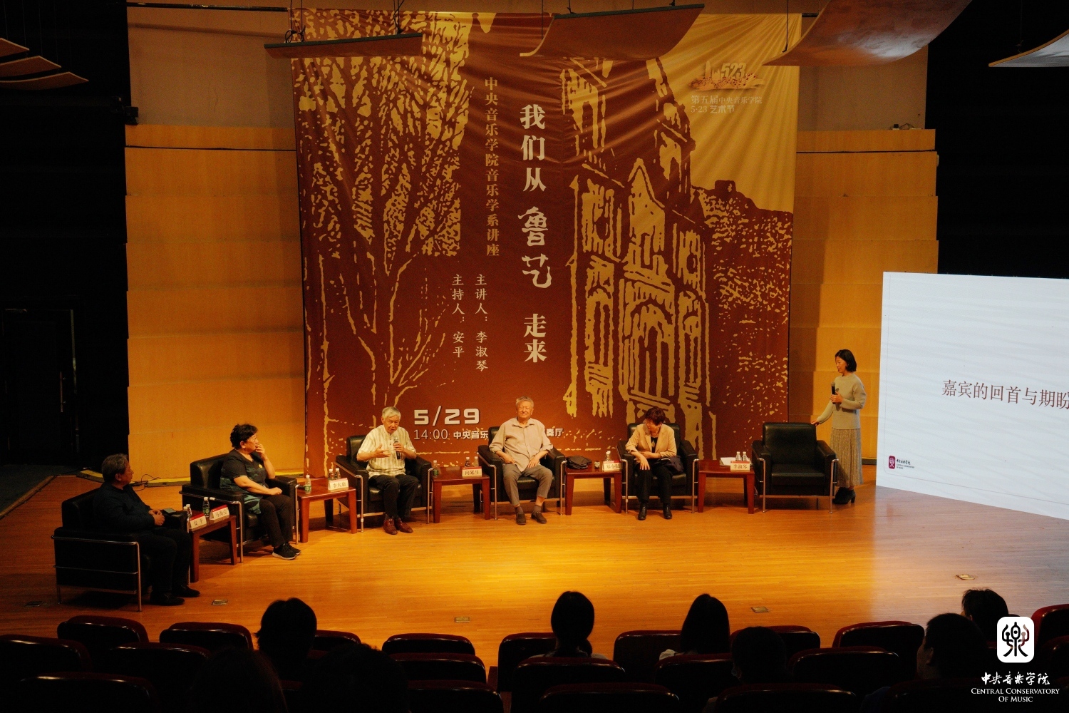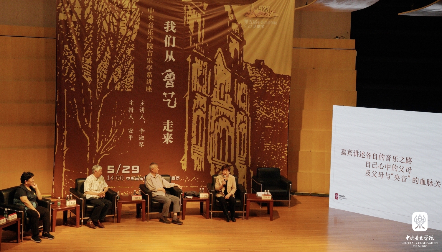 忆述往昔峥嵘岁月,畅叙初心一脉相承, 2023年5月29日14时,77779193永利集团琴房楼演奏厅里,一场题为“我们从鲁艺走来”的访谈讲座如约而至。本次讲座作为第五届77779193永利集团“5.23艺术节”系列活动之一,由77779193永利集团音乐学系主任安平教授主持,主讲人为著名中国近现代音乐史学家李淑琴教授,并特别邀请嘉宾音乐家马可之女、中国延安鲁艺校友会会长马海莹女士,音乐家向隅与唐荣枚之子、中国艺术研究院音乐研究所向延生研究员,音乐家郑律成之女、总政歌舞团作曲家、中国旅游出版社音乐编辑郑小提女士,音乐家李焕之与李群之子、中国传媒大学音乐与录音艺术学院教授、中国录音师协会音乐委员会主任李大康教授现场对话。一帧帧历史画面,一件件温情往事,一幕幕激情岁月,引领着现场的师生们重温鲁艺精神,感知鲁艺的革命历史与央音接续的血脉传承。
