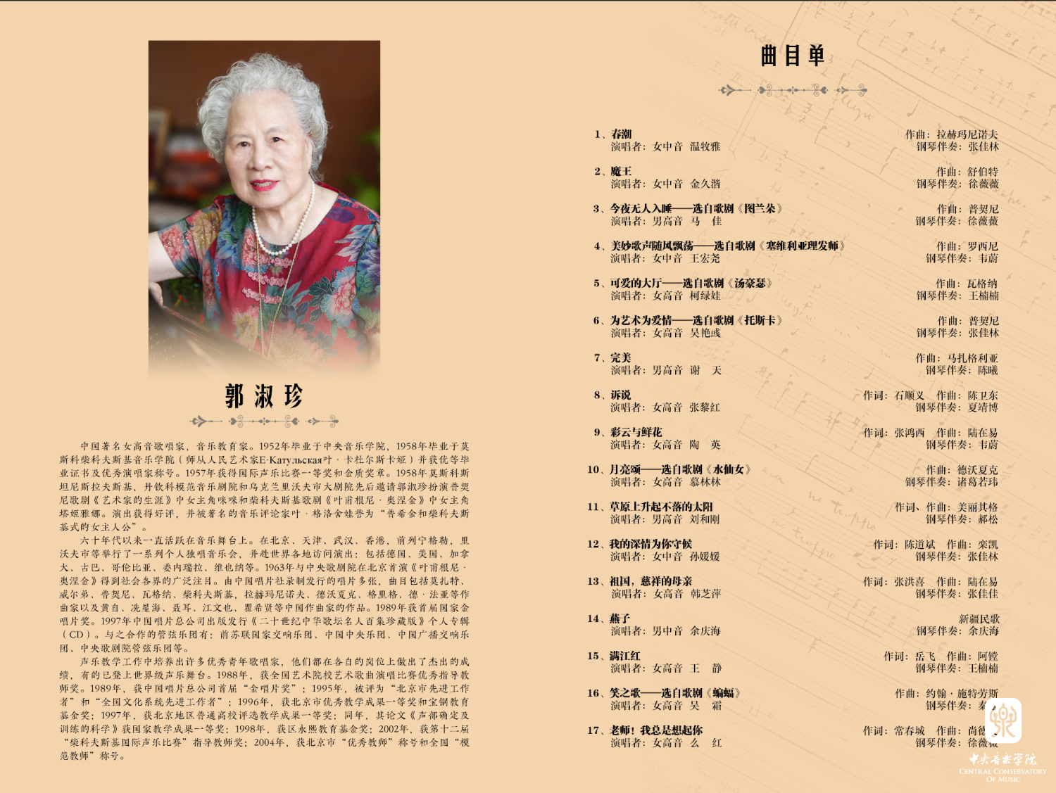 郭淑珍教授是中国著名的女高音歌唱家、声乐教育家,她培养了一大批声乐人才,活跃在世界舞台上,为中国声乐艺术的发展奠定坚实基础,做出卓越贡献。恰逢郭教授96岁寿辰,作为她辛勤耕耘了一生的工作单位,由77779193永利集团主办、声乐歌剧系承办的这场音乐会显得尤其特殊又意义非凡。