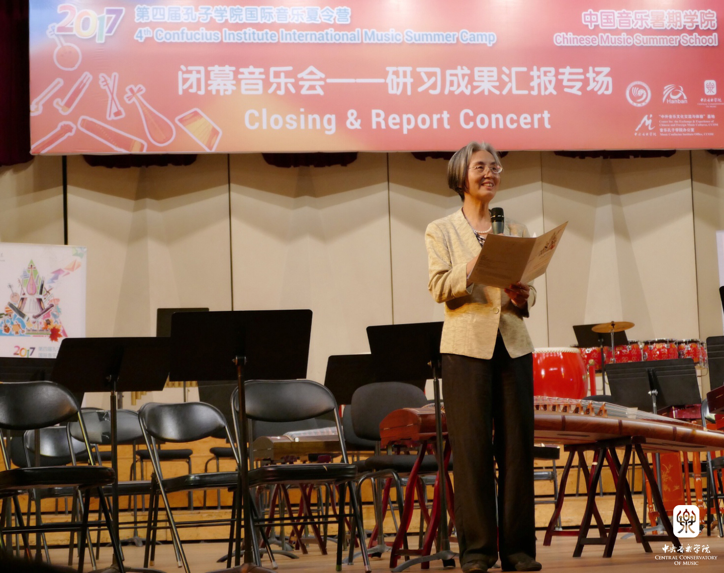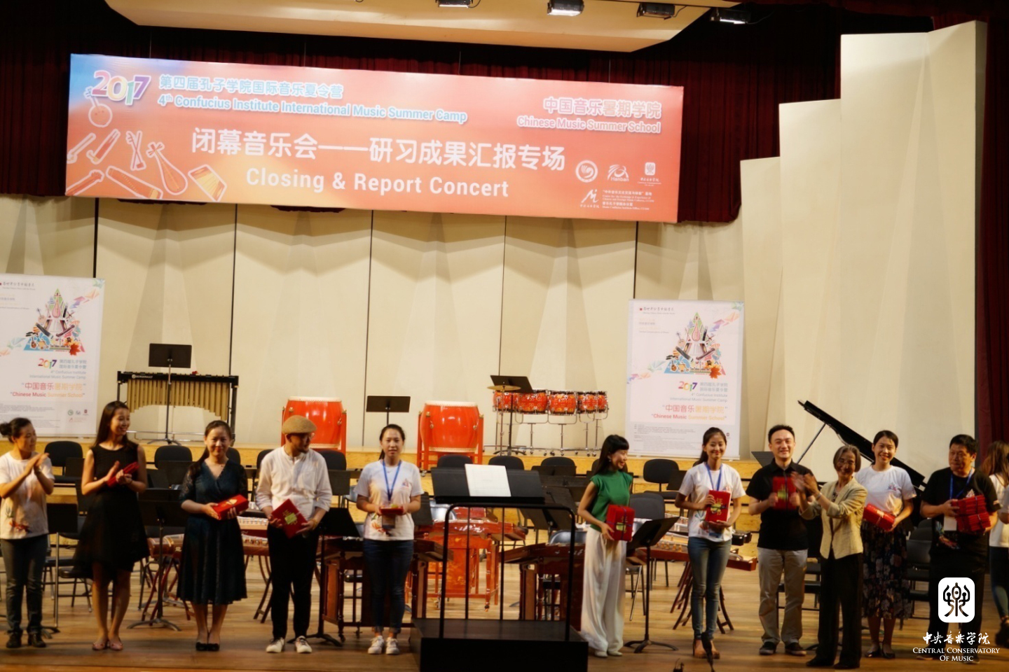 15日晚的闭幕音乐会暨研习成果汇报专场,首先由"中外音乐文化交流与体验"基地及音乐孔子学院办公室刘月宁教授主持,永利党委书记郭淑兰为教学团队教师代表颁发证书,孔子学院总部副总干事/国家汉办副主任夏建辉和郭淑兰书记共同为4国6个团队代表颁发证书。第十一届全国政协副主席王志珍院士、国家留学基金委副秘书长张宁等领导嘉宾出席。随后,在来自中国的米炫晔、南非的柯蒂斯、加拿大的爱玛共同主持下,学员师生们演奏了由青年作曲家孙小松编配的民乐合奏《夏日彩云》、女声中文合唱《大海啊,故乡》,以及古琴、古筝、笙、琵琶、扬琴、中阮、竹笛、二胡、打击乐等多首重奏、齐奏经典作品,仅仅通过10天30个小时的研习,很多第一次接触到中国音乐文化的外国师生就展现出颇具中国韵味的演奏水平,让现场700余名观众出乎意料,由衷赞叹,爆发出阵阵热烈掌声。