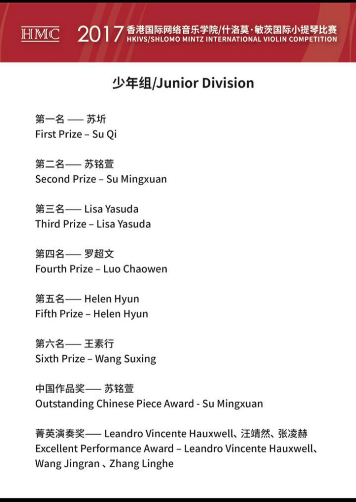 在刚刚结束的2017HKIVS/什洛莫·敏茨国际小提琴比赛上,经过少年组三轮、青年组四轮的激烈角逐,永利学生取得骄人成绩。