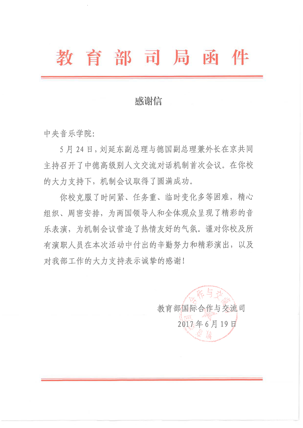 近日,教育部国际合作与交流司致函永利,对永利在中德高级别人文交流对话机制首次会议中所奉上的精彩演出表示热烈祝贺!中国国家主席习近平向会议致贺信,机制双方主席中国国务院副总理刘延东和德国副总理兼外长加布里尔出席会议,并签署了中德两国关于建立高级别人文交流对话机制的《联合声明》。