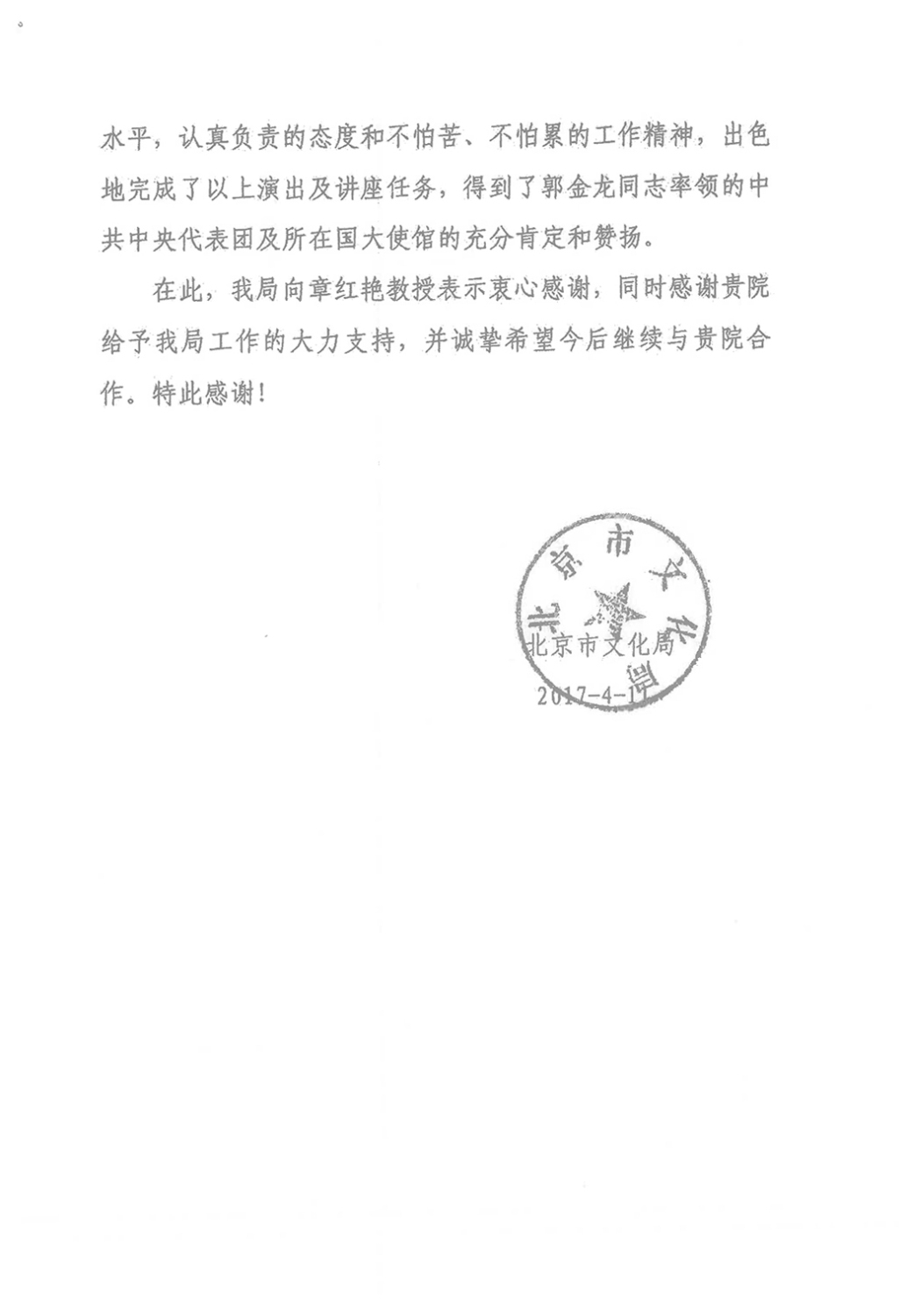 近日,北京市外事办公室和北京市文化局分别致函永利,对永利在中共中央代表团访问莫桑比克、坦桑尼亚及阿联酋期间,积极支持"北京之夜"的文艺演出表示诚挚谢意!演出很好地展示了中国民乐的风采、魅力,圆满完成了中联部、北京市委、市政府的任务,得到郭金龙同志、各国政府和当地观众的高度评价!并对永利民乐系章红艳教授高超娴熟的演奏、优良的工作作风给予高度赞扬!