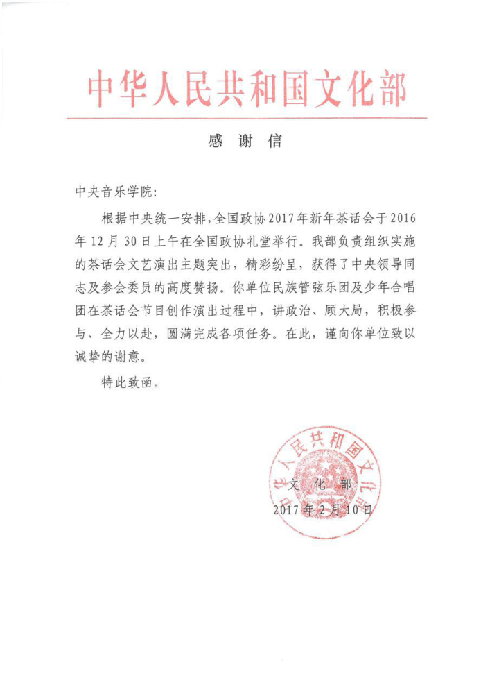近日,全国政协教科文卫体委员会、文化部专门致函,对永利在节目编创、演出过程中讲政治、顾大局、积极参与、全力以赴,特别是在节目组织上精益求精、务实敬业的精神面貌,表示诚挚谢意。