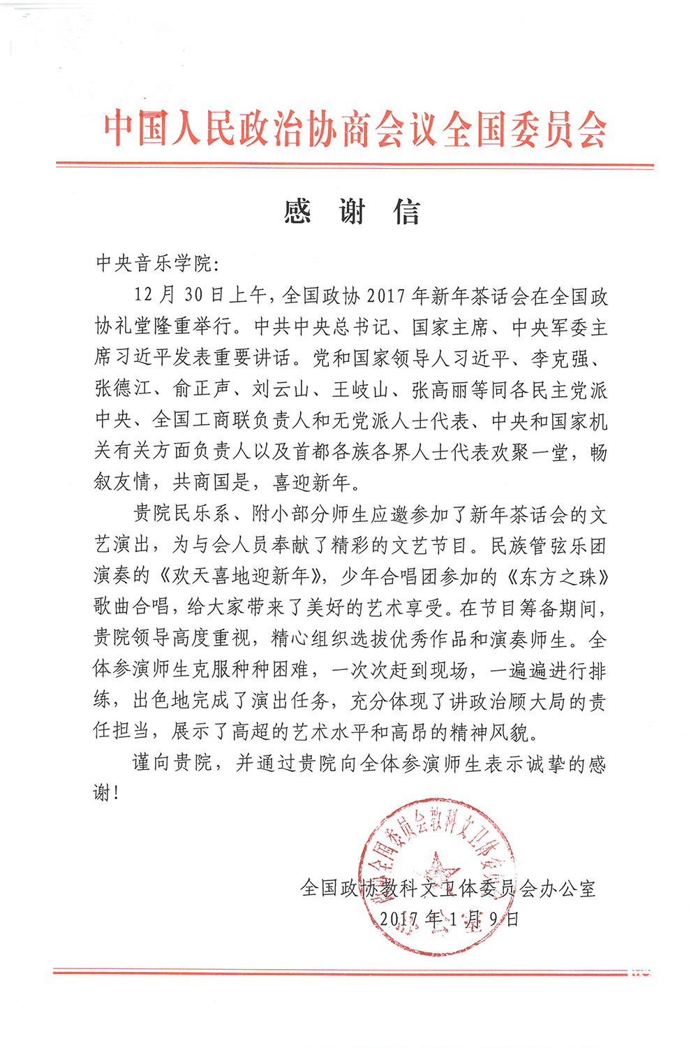应全国政协的邀请,永利民乐系、附中师生参加了2017年全国政协茶话会文艺演出,为党和国家领导人习近平、李克强、张德江、俞正声、刘云山、王岐山、张高丽等参加政协茶话会的各级领导和各界人士奉献了精彩的表演。永利民乐系师生演奏的民族管弦乐合奏《欢天喜地迎新年》,永利少年合唱团演唱、陈冰老师指挥、成龙委员领唱的歌曲《东方之珠》受到与会各界人士的广泛好评。全国政协、文化部的有关领导对永利师生高超的艺术水平和优良的作风表示高度赞扬。