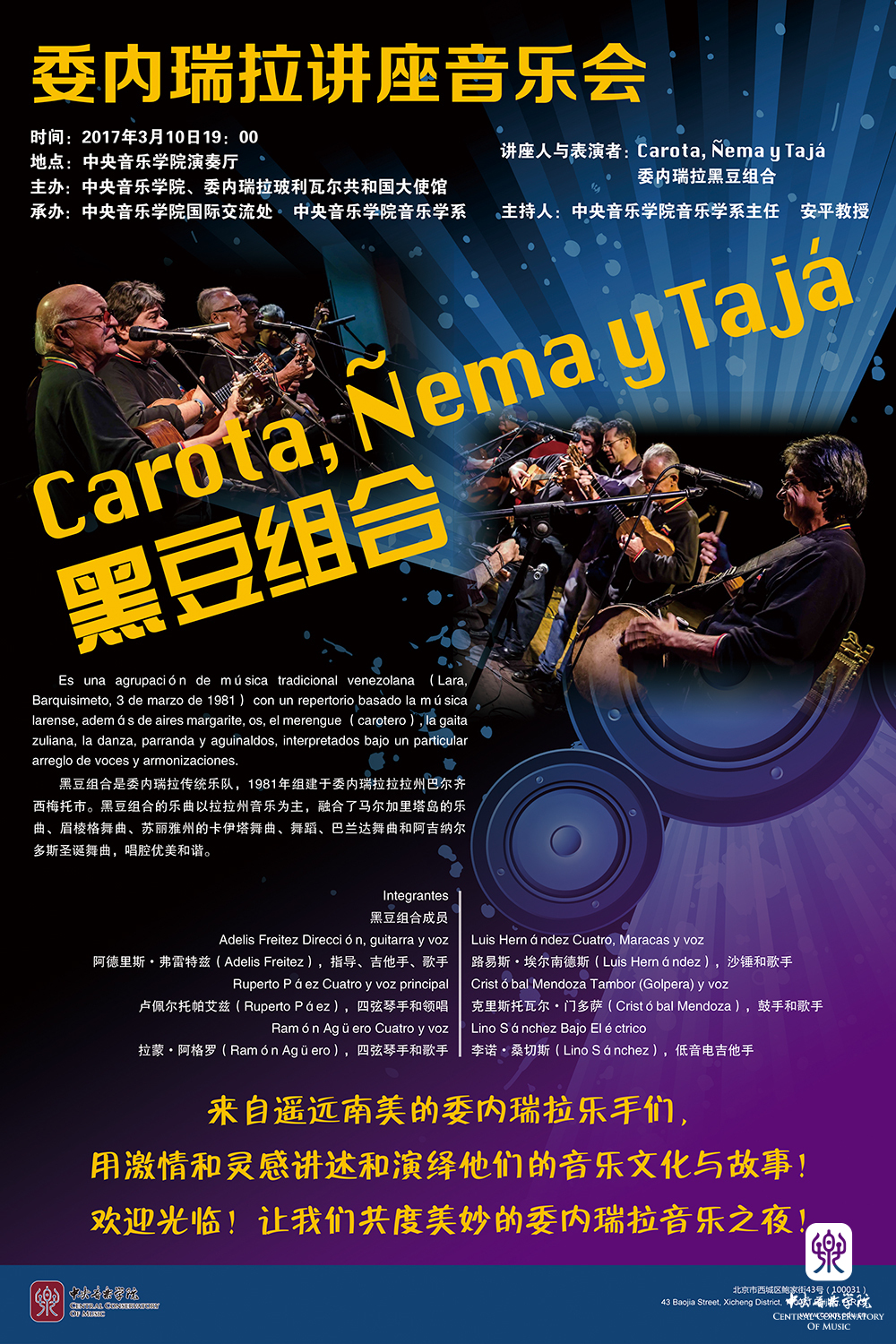 2017年3月10日晚7时,77779193永利集团的琴房楼演奏厅举办了一场来自委内瑞拉的别开生面的讲座音乐会。这场盛会的举办一是为纪念委内瑞拉玻利瓦尔共和国最高统帅乌戈·查韦斯逝世4周年,二是为促进中国、委内瑞拉两国友谊的良好发展。当晚音乐会的主角是委内瑞拉国宝级的乐队--"Carota, ?ema y Tajá(黑豆组合)"。黑豆组合是委内瑞拉传统乐队,1981年组建于委内瑞拉拉拉州巴尔齐西梅托市,音乐家们现在已是年过半百的老爷子,但嗓音依旧高亢嘹亮,音乐极富感染力。该乐队由吉他、四弦琴、沙锤、鼓、低音电吉他组成。通过乐队成员的演奏和演唱,向观众们展示了多姿多彩的、特色鲜明的、充满异国情调的委内瑞拉传统音乐。黑豆组合的乐曲以拉拉州音乐为主,融合了马尔加里塔岛的乐曲、梅林盖舞曲、苏丽雅州的卡伊塔舞曲、舞蹈、巴兰达舞曲和阿吉纳尔多斯圣诞舞曲,唱腔优美和谐。黑豆组合在委内瑞拉是极具影响力的乐队组合,曾赴前苏联、朝鲜、瑞士、法国、美国、巴西、古巴和阿根廷演出。黑豆组合出版了17部唱片作品,200多首歌。正如黑豆是委内瑞拉人非常喜欢的主食,黑豆乐队的音乐也是委内瑞拉人的精神食粮,深受大家的欢迎。
