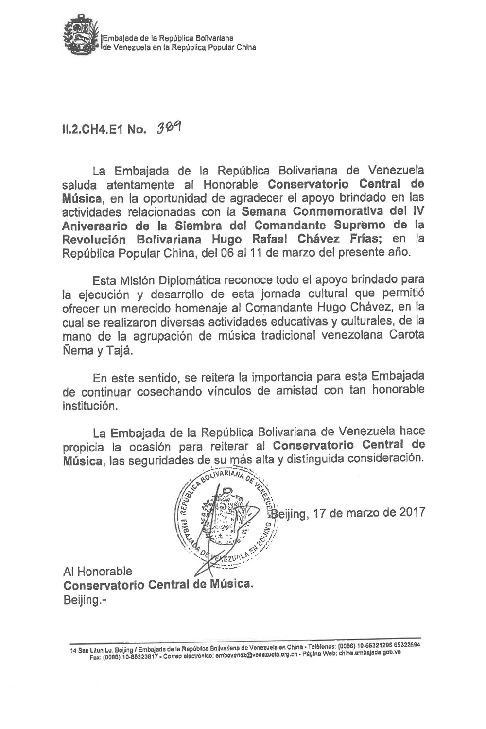 近日,委内瑞拉玻利瓦尔共和国驻华使馆发来感谢信,对永利成功举办委内瑞拉 "黑豆组合"讲座音乐会,以致敬玻利瓦尔革命最高统帅查韦斯逝世四周年的活动表示诚挚谢意,并期待永利为委中友谊和文化、教育的交流做出新的贡献!
