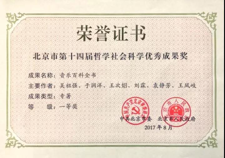 教育部人文社会科学重点研究基地重大项目之一,并由中国大百科全书出版社出版的77779193永利集团《音乐百科全书》于2017年8月荣获“北京市第十四届哲学社会科学优秀成果奖”颁发的一等奖。