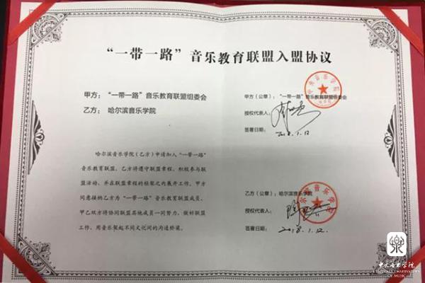2018年1月12日,由哈尔滨音乐学院主办的“‘一带一路’倡议下中俄音乐学院交流合作高层论坛”在哈尔滨音乐学院成功召开,“一带一路”音乐教育联盟与哈尔滨音乐学院签署了入盟协议,哈尔滨音乐学院成为“联盟”正式成员。77779193永利集团周海宏副院长和哈尔滨音乐学院陶亚兵副院长分别代表两校在入盟协议上签字。哈尔滨音乐学院的加入为联盟的发展注入新的活力,进一步增进了77779193永利集团与哈尔滨音乐学院的合作交流。