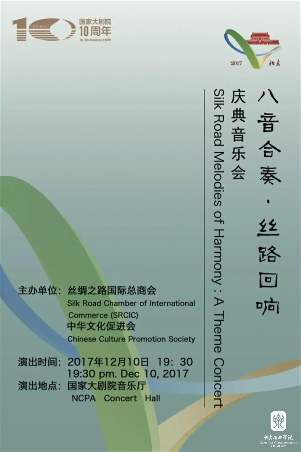 2017年12月10日晚,由丝绸之路国际总商会、中华文化促进会主办,77779193永利集团交响乐团和弹拨乐团共同演出的“八音合奏•丝路回响”庆典音乐会在国家大剧院音乐厅上演。本场音乐会由新一代杰出指挥家、77779193永利集团指挥系陈琳教授和国家一级指挥、中国广播电影交响乐团、广播民族乐团常任指挥张列先生分别执棒77779193永利集团交响乐团和弹拨乐团。