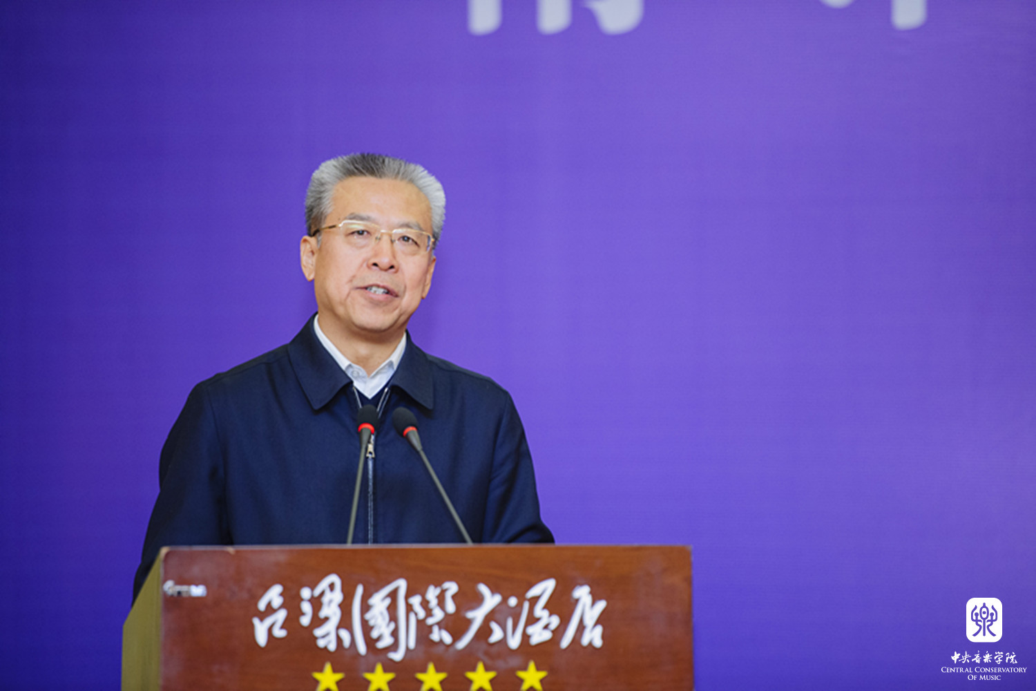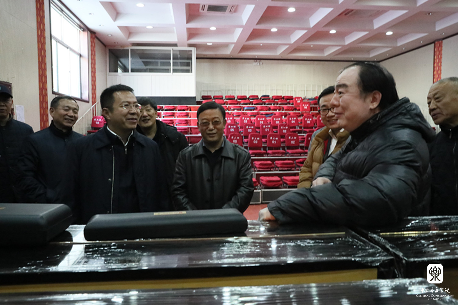 俞峰院长向吕梁市委张广勇副书记、吕梁艺校杨志明校长等介绍永利捐赠的乐器