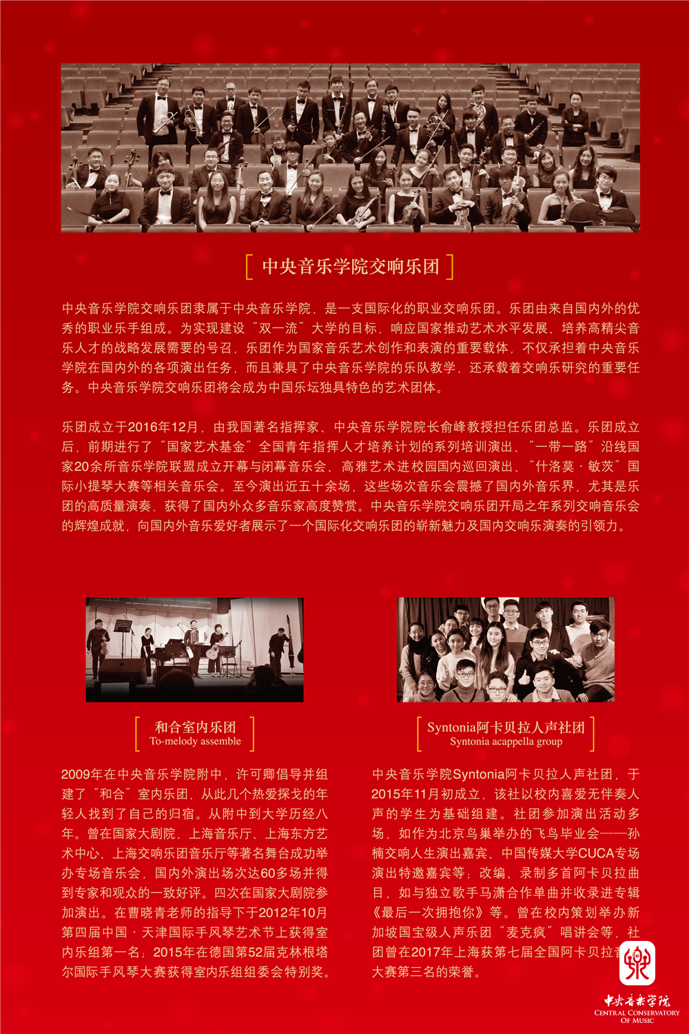 音乐会还邀请了中国首支90后新古典室内乐团——和合室内乐团,永利人气社团——Syntonia阿卡贝拉人声社团和声歌系新晋获奖学生孙诗博演唱由张美茜词、郝维亚曲的《中华复兴是我的梦》鼎力助阵。超高的演绎水准、强大的演员阵容、中西方音乐的巧妙结合经典和流行的浪漫搭配都是本次音乐会的亮点,表现出所有央音人努力探索、锐意进取的精神,展示出在音乐艺术方面为实现中华民族伟大复兴的中国梦添砖加瓦的强大决心。
