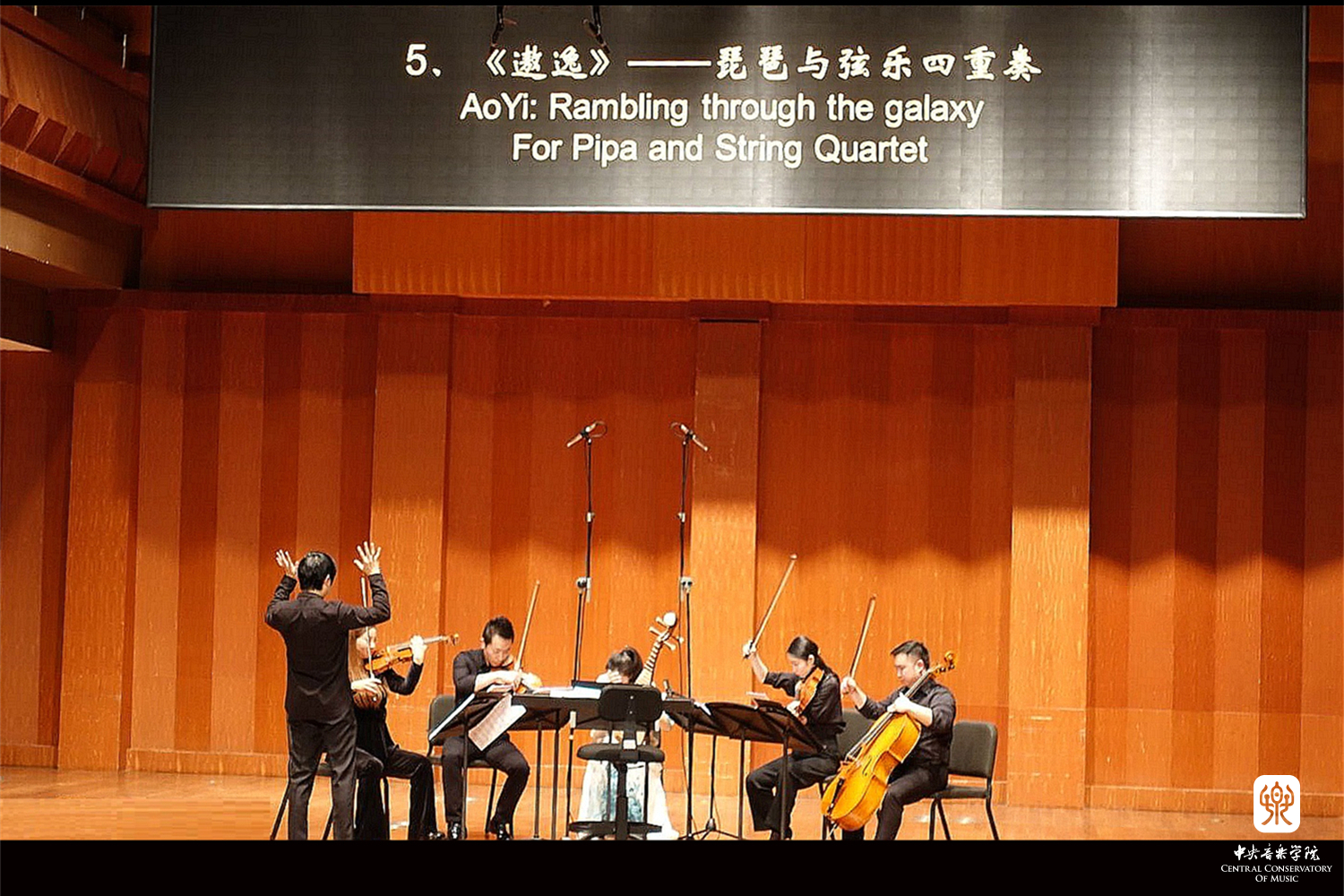 文子洋同学的参赛作品《遨逸—为琵琶与弦乐四重奏而作》通过对琵琶订弦的改变与各种不同声响的多重结构组合,试图表达出庄子笔下“自然之乐”的逍遥境界。在此向获奖学生及指导教师贾国平教授表示祝贺。
