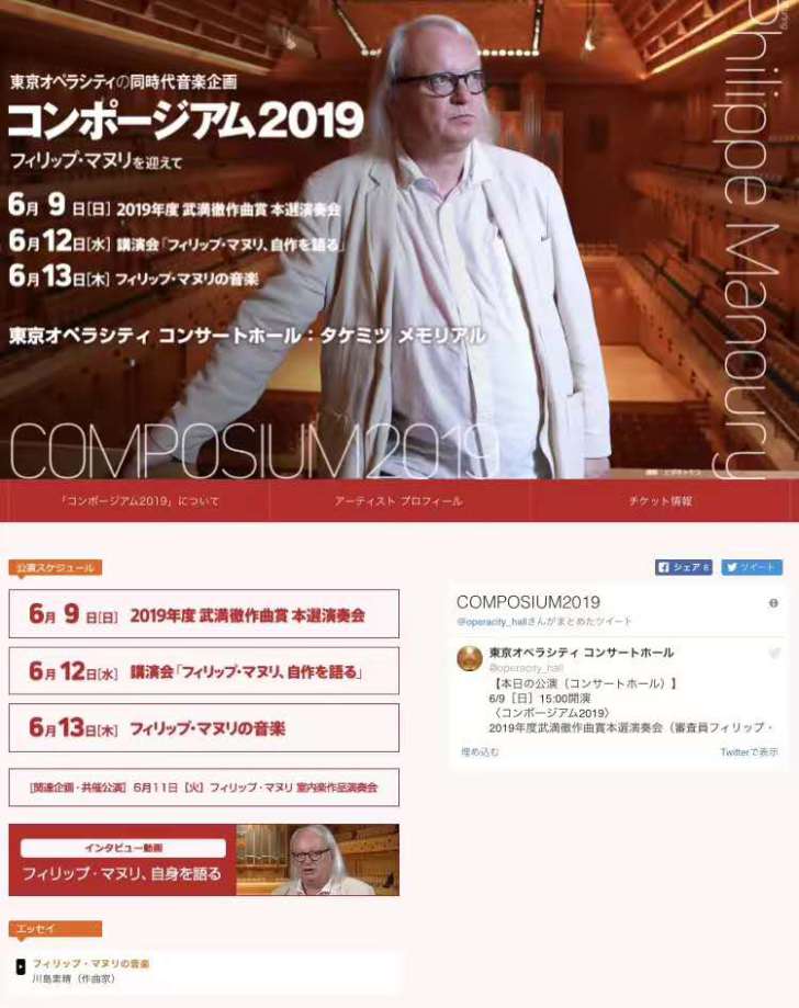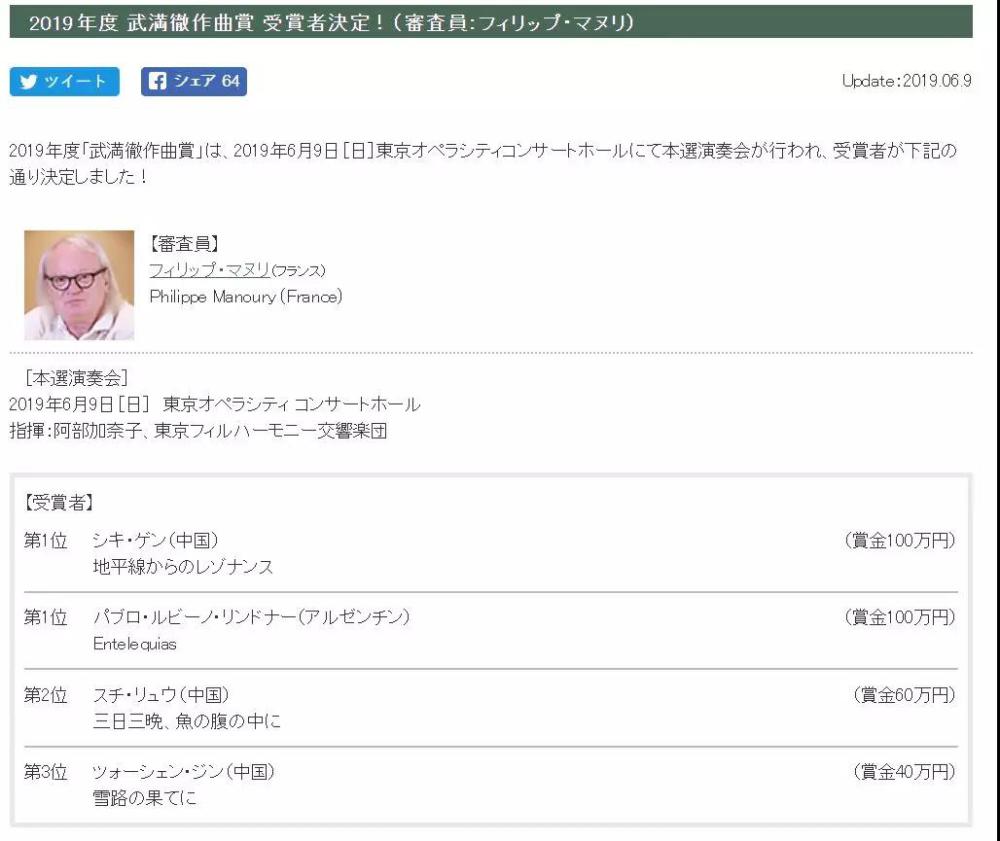 作为日本最为声名显赫的作曲大奖,武满彻作曲比赛每年颁发一次,每次大奖只设一位评委,里盖蒂、迪蒂耶、贝里奥,细川俊夫,萨莉亚霍等作曲家都曾担任过该项比赛的评委。今年的评委是法国作曲家Philippe Manoury。
