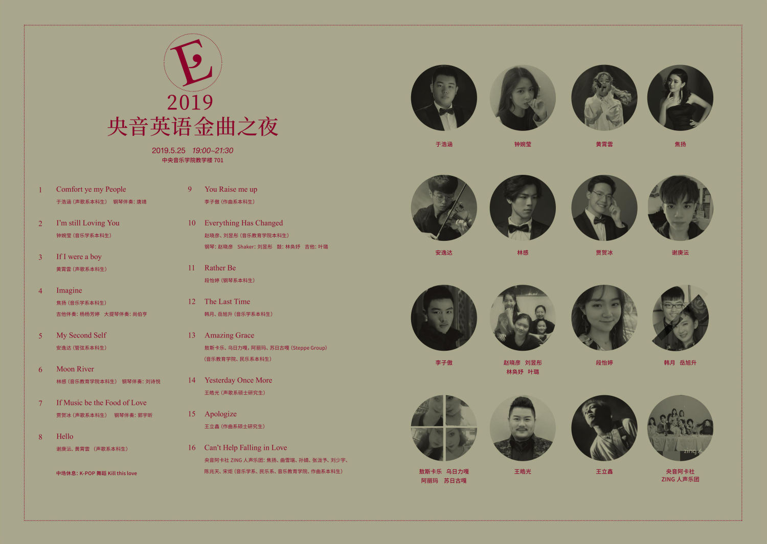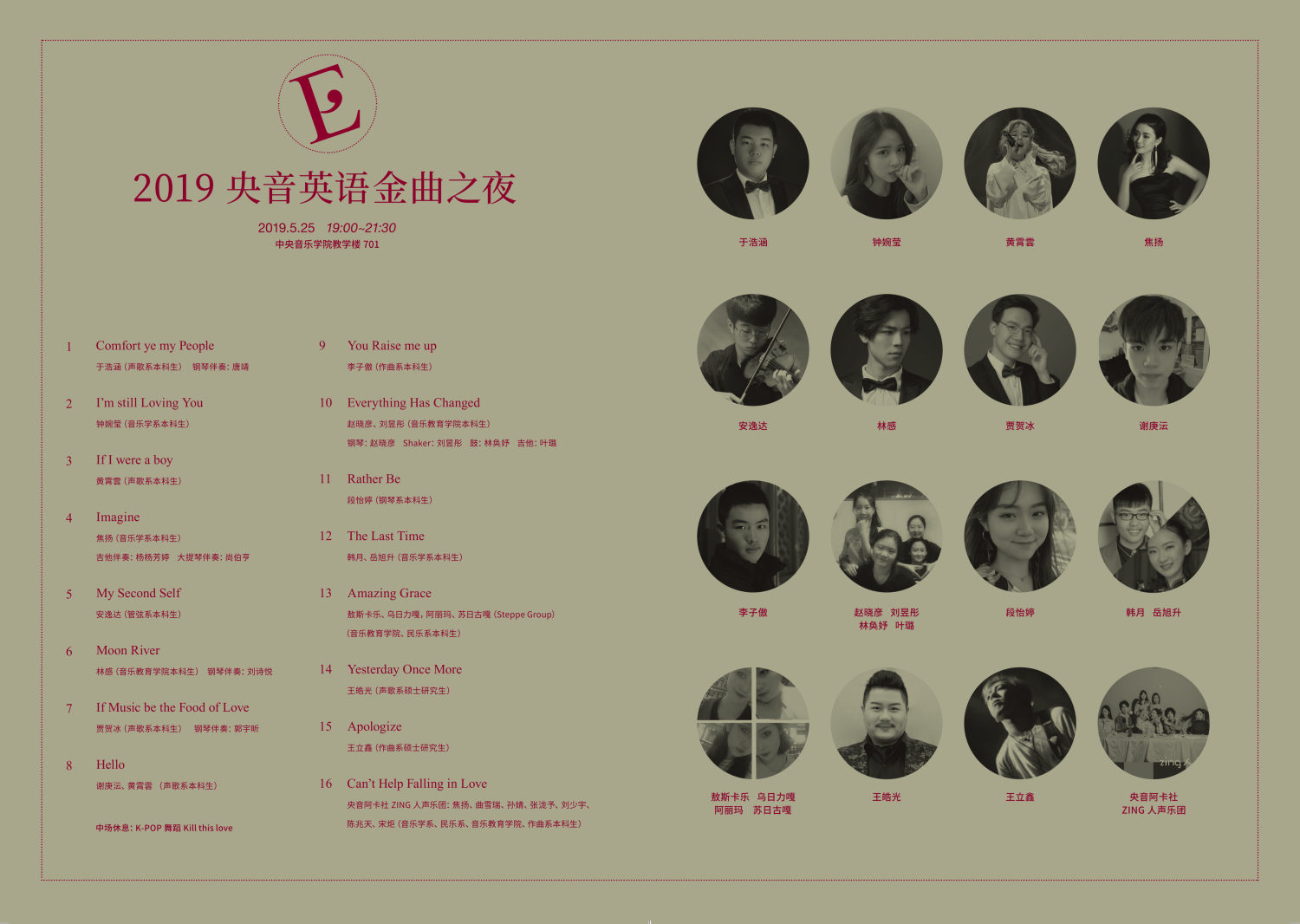 25日(周六)晚,“2019央音英语金曲之夜”,让英语与歌声互融互长,让英语插上情感的翅膀!时间:19:00,地点:教学楼701,凭票入场,票务咨询电话:66425682