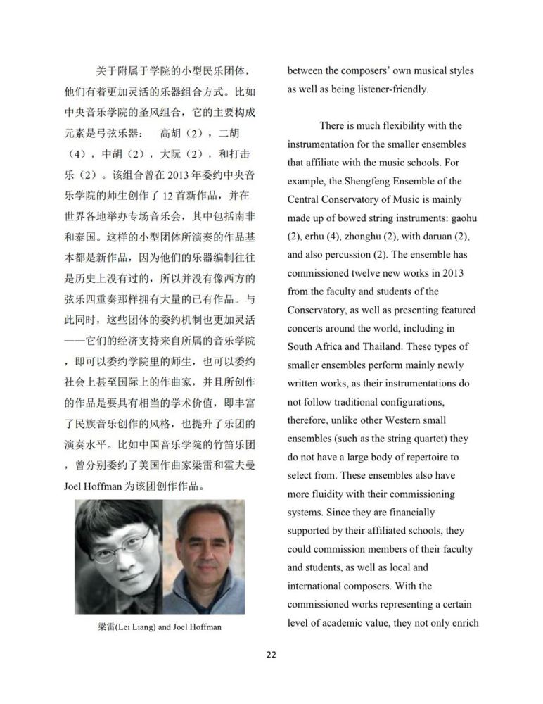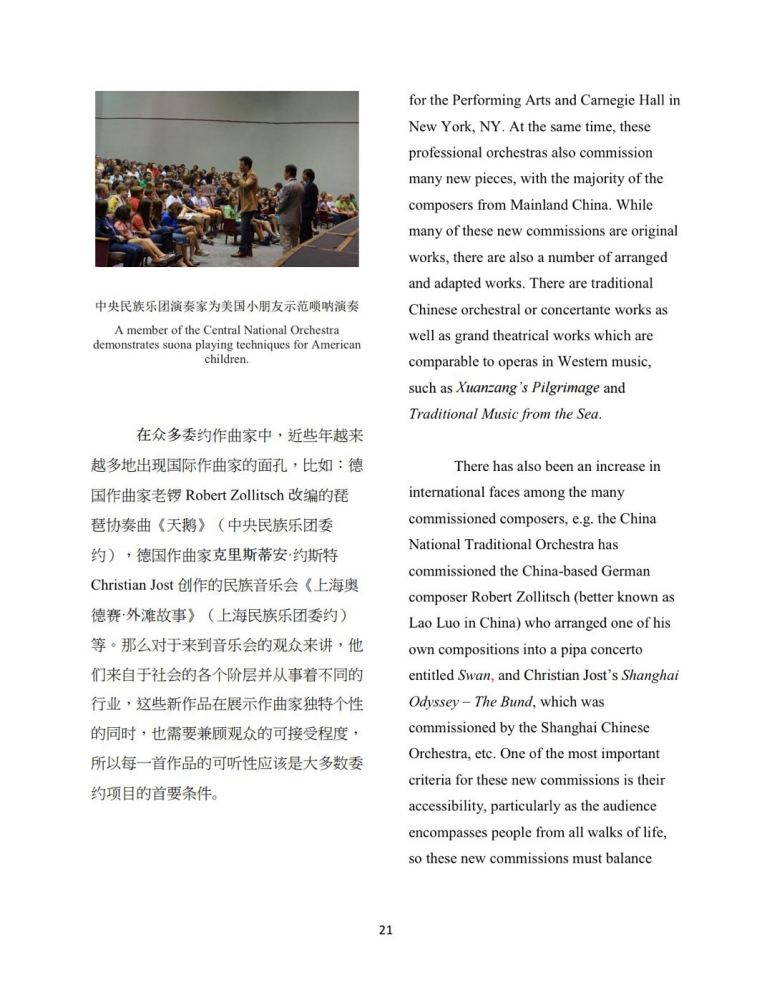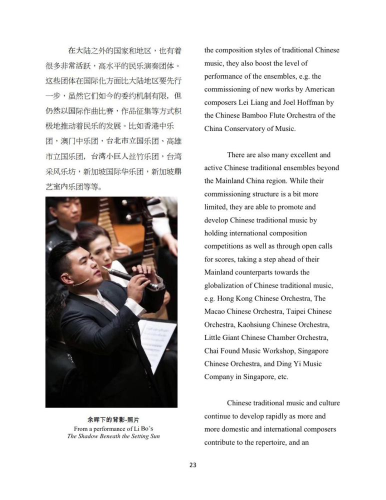 这篇文章保持了很强的客观性和容纳性;将中国民族乐队的起源,发展,以及现状通过该杂志向国际音乐平台得以良好展示,这些内容也形成了一个提供海外音乐学者了解中国民族音乐的窗口。此外,李博还对当代中国民族音乐委约与创作的现状进行了梳理——分别以市场化的专业民乐团体和学院里的民乐室内乐团为例,介绍了中国当代民族音乐多维度的创作状态。随着中国文化事业的蓬勃发展,每年有越来越多的民族乐团赴海外举办专场音乐会以及相关民乐普及活动。在这些优秀民乐作品大放异彩的同时,该文以客观易懂的方式为民族音乐文化在世界范围内的传播添砖加瓦。