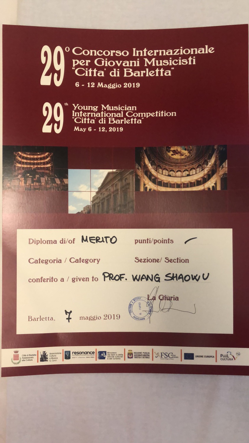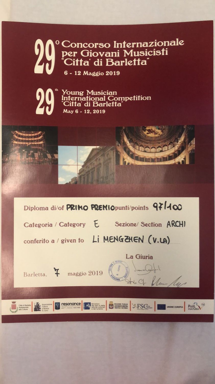 在2019年5月6日-5月12日,第二十九届意大利青年国际音乐比赛“Città di Barletta”弦乐比赛中永利管弦系研究生李孟真荣获青年组第一名,指导教师王绍武教授获得最佳指导教师奖。