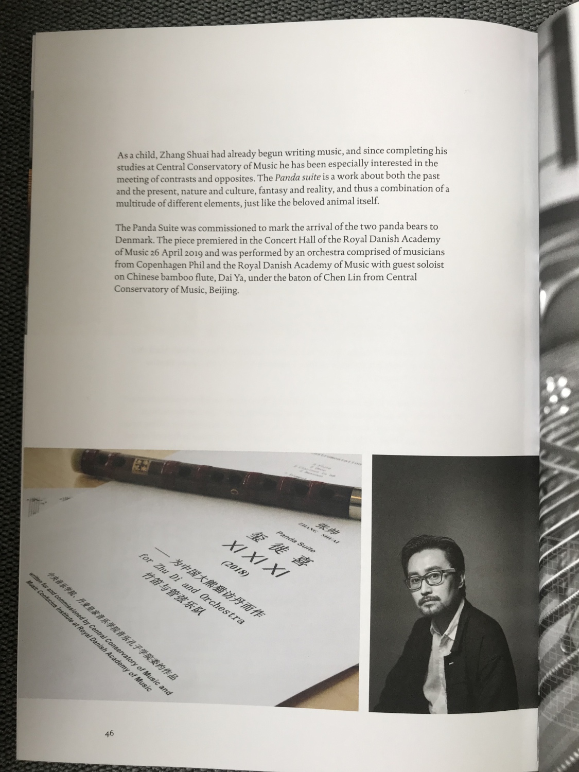 A:丹麦皇家音乐学院的音乐学教授Soren Schauser 为熊猫组曲写了一个乐曲简介,我之前不认识这个人,是MCI邀请他写的。估计他听了小样或排练后写了这篇简介印制在宣传册和节目单上。我看完觉得很有意思。他从来没和我沟通过,仅仅凭借听音乐和一些基本的背景资料,他写出了非常美的文章,充满了他对这个作品的理解和想象。我感觉他写的简介比我写的还好。这就是音乐的魅力吧。