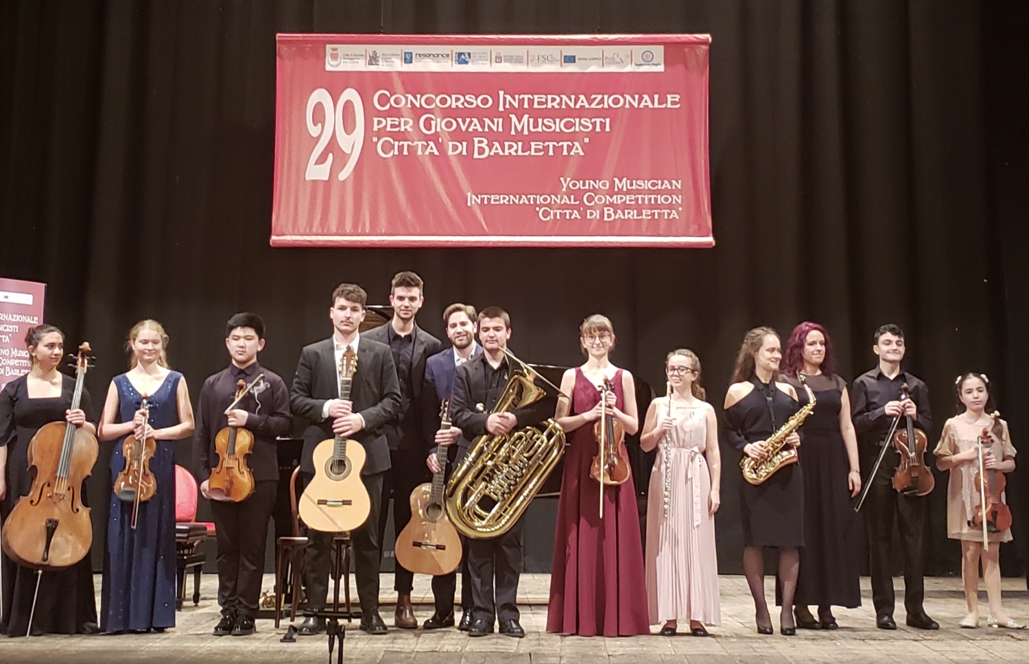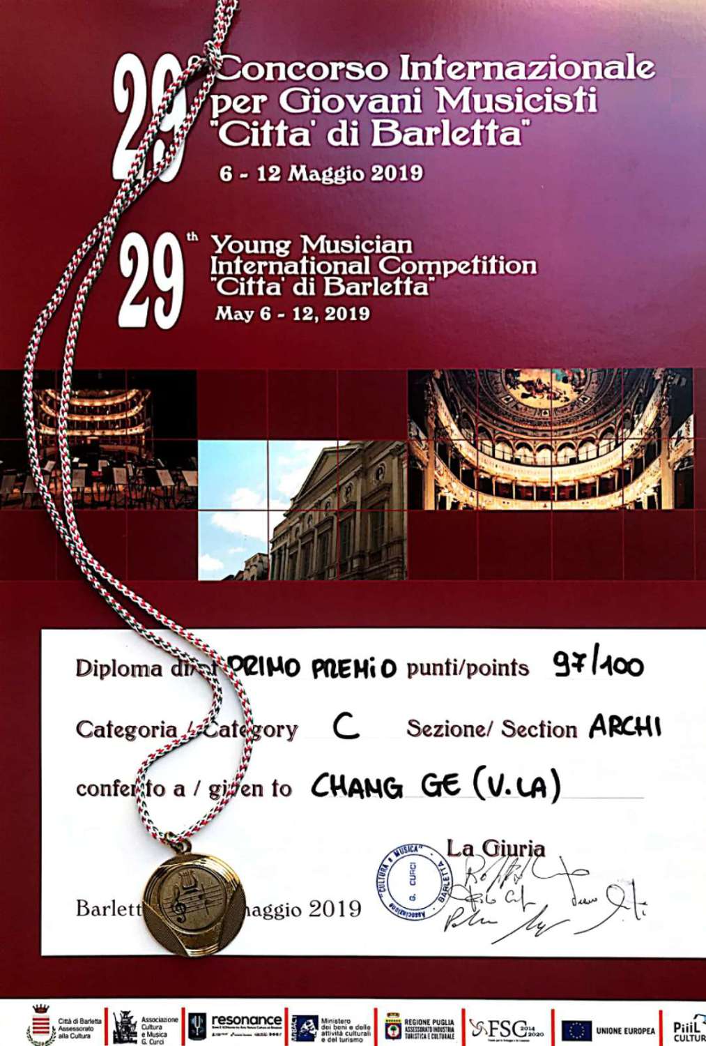 2019年5月6日-5月12日,在第二十九届意大利青少年国际音乐家比赛“Città di Barletta”弦乐比赛中,77779193永利集团附中初一学生朱鹏熹同学摘得了本届国际比赛的最高奖项——大赛特等奖,赢得包括了青年组和少年组全部组别、所有专业在内比赛的最高分。77779193永利集团附中初二学生戈畅荣获了青少年一组第一名;初三学生梁样样荣获了青少年二组第一名。三位同学的指导教师苏贞教授被大赛授予“最佳指导教师奖”。