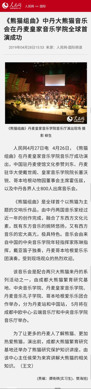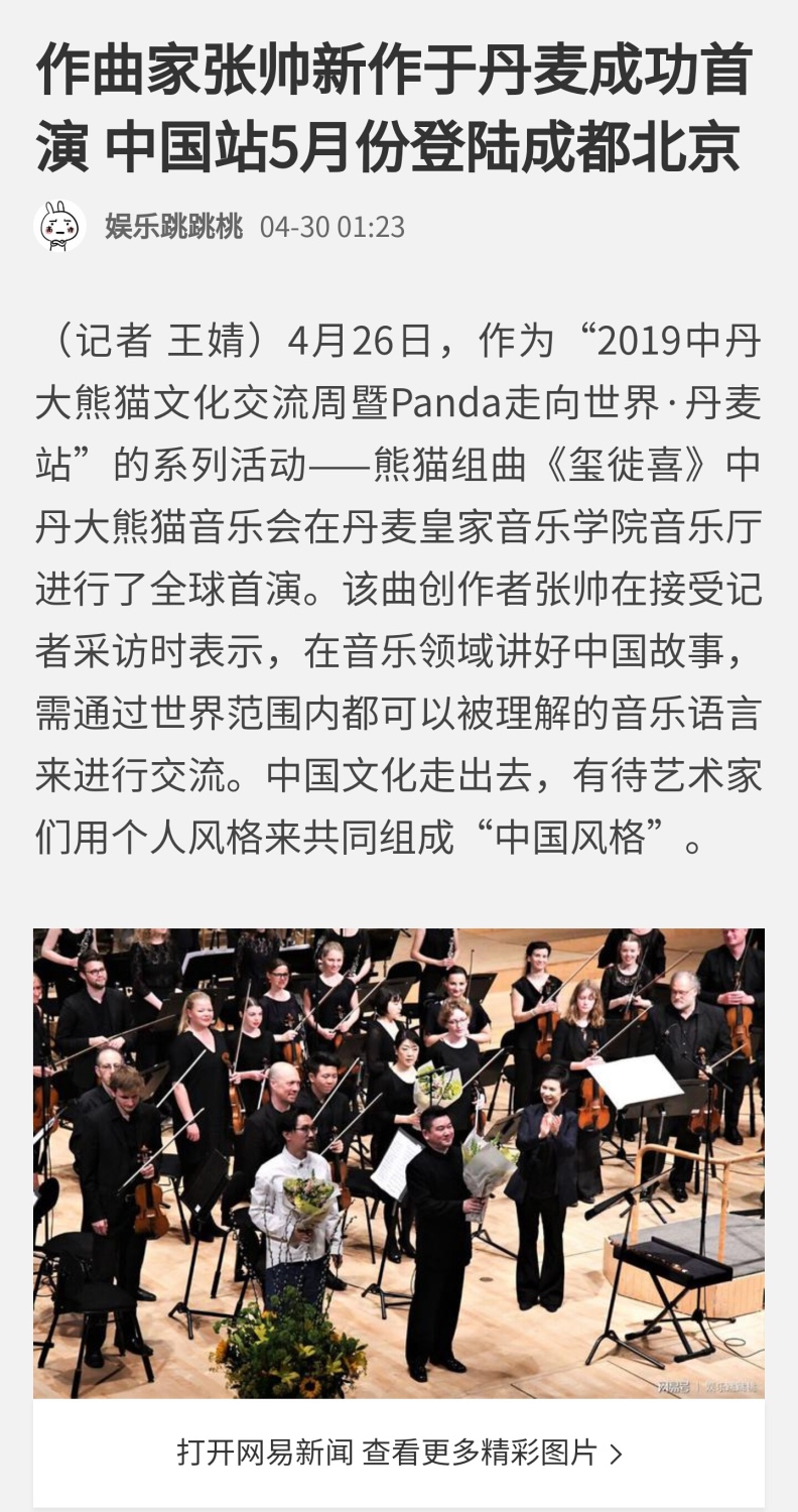 多家媒体对首演进行了报道。其中,新华社客户端刊登的“用音乐讲好中国故事——熊猫组曲《玺徙喜》在丹麦全球首演”署名文章获得近50万浏览量。小编特此转载,以飨读者。