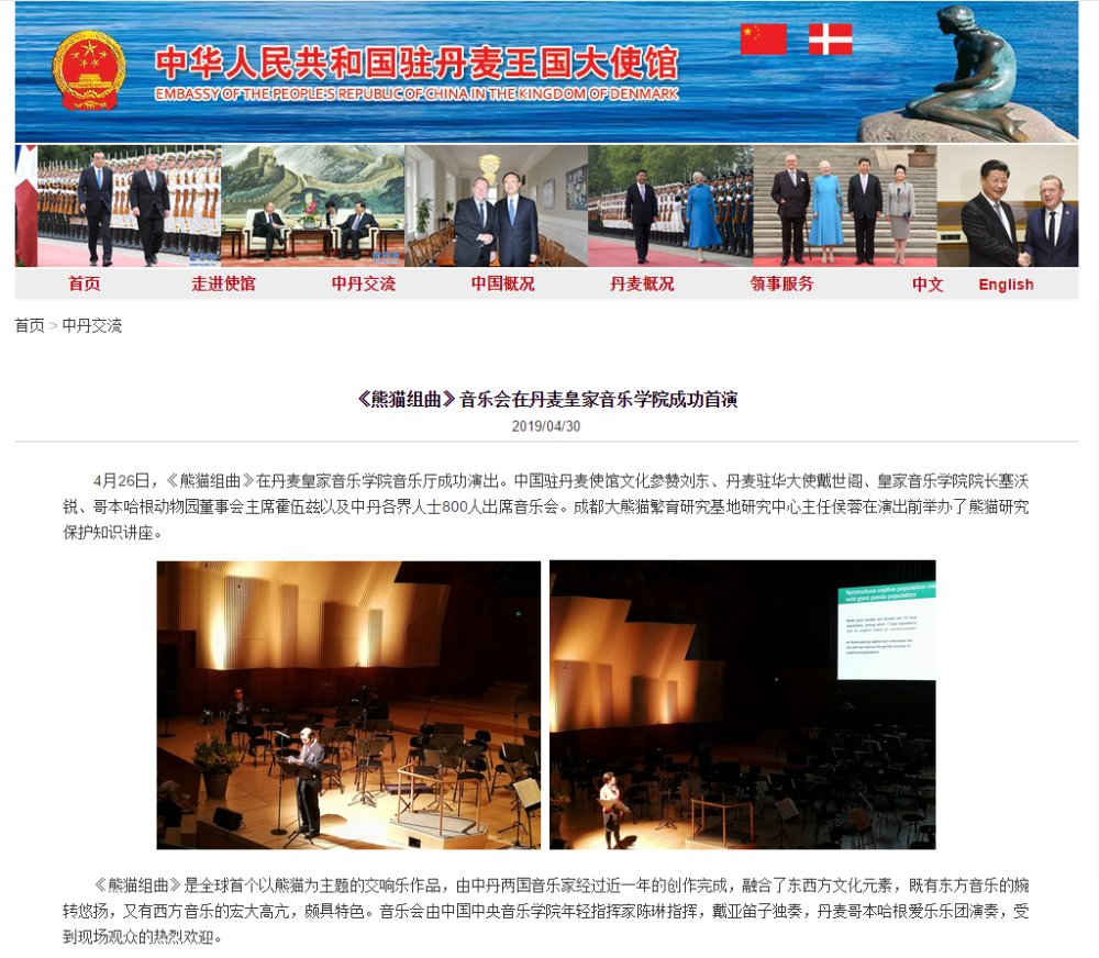 “熊猫组曲”《玺徙喜》的策划、创作与演出属于“2019中丹大熊猫文化交流周暨Panda走向世界·丹麦站”系列活动之一,本次活动由77779193永利集团、丹麦皇家音乐学院、音乐孔子学院、哥本哈根爱乐乐团、成都大熊猫繁育研究基地及孔子学院总部合作举办。首演获得中丹政商文化各界约800位听众热烈好评。
