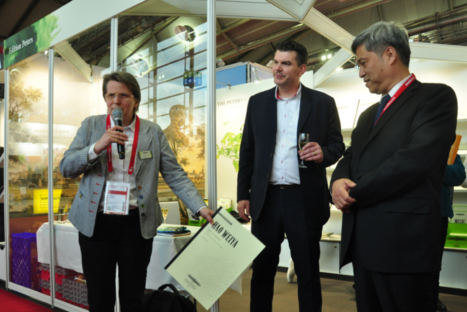 在当日稍晚的招待酒会上,法兰克福展会负责人也进行了致辞,表达了对两家出版社的新项目的祝贺。参展的各大出版社代表以及对中国新音乐创作感兴趣的来宾也参加了招待活动,他们对此次出版作品的创作和演出情况提问,对作曲家的情况进行了了解,并对两家出版社的合作和发展表达了祝愿。
