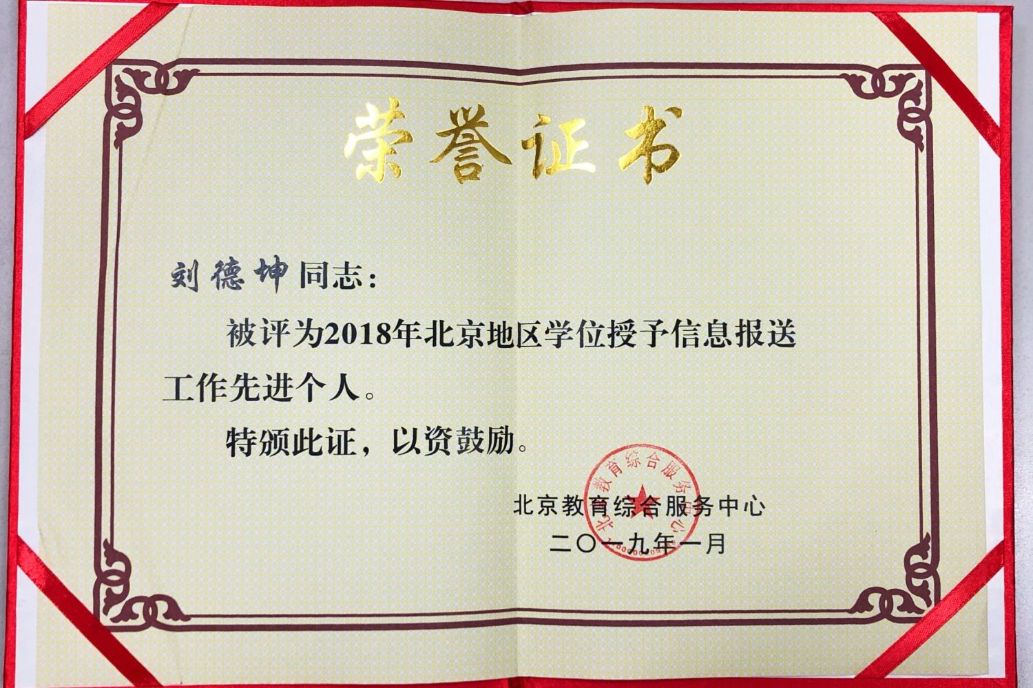 2019年4月11-12日,北京市学位委员会办公室召开北京地区学位授予信息报送工作培训会。会上,表彰了在2018年北京地区学位授予信息报送工作中,责任意识强,工作效率高,业务熟练,成绩突出,能够积极协调单位内部各部门关系,保证本单位学位授予信息报送工作顺利开展的人员。经学位授予单位推荐、个人申报、表彰工作小组集中评选、社会公示,永利艺术硕士与学位管理办公室刘德坤老师荣获2018年北京地区学位授予信息报送工作“先进个人”称号。