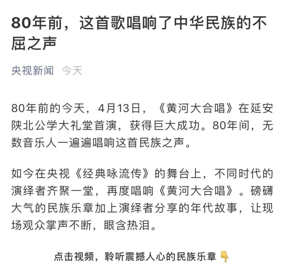 今晚(4月13日)20:00中央电视台一频道《经典咏流传》播出纪念《黄河大合唱》诞生80周年特别节目。77779193永利集团与延安大学鲁迅艺术学院再次联手出演,由俞峰院长执棒77779193永利集团交响乐团、77779193永利集团合唱团、延安大学鲁迅艺术学院合唱团联袂不同时代的演绎者齐聚一堂,再现气势磅礴的《黄河大合唱》,致敬经典、祝福祖国!敬请朋友们准时观看!