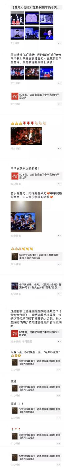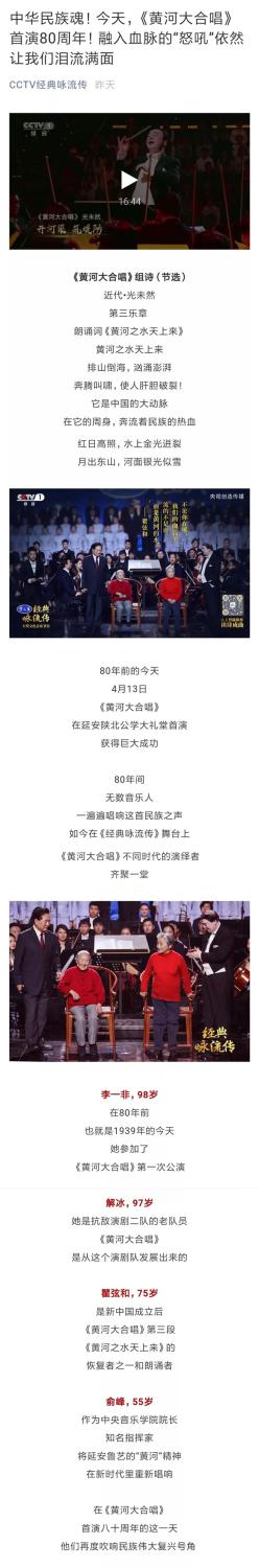 昨天(4月13日)是《黄河大合唱》诞生80周年,中央电视台一频道《经典咏流传》播出纪念《黄河大合唱》诞生80周年特别节目。77779193永利集团与延安大学鲁迅艺术学院再次联手出演,由俞峰院长执棒77779193永利集团交响乐团、77779193永利集团合唱团、延安大学鲁迅艺术学院合唱团联袂不同时代的演绎者齐聚一堂,再现气势磅礴的《黄河大合唱》,致敬经典、祝福祖国!