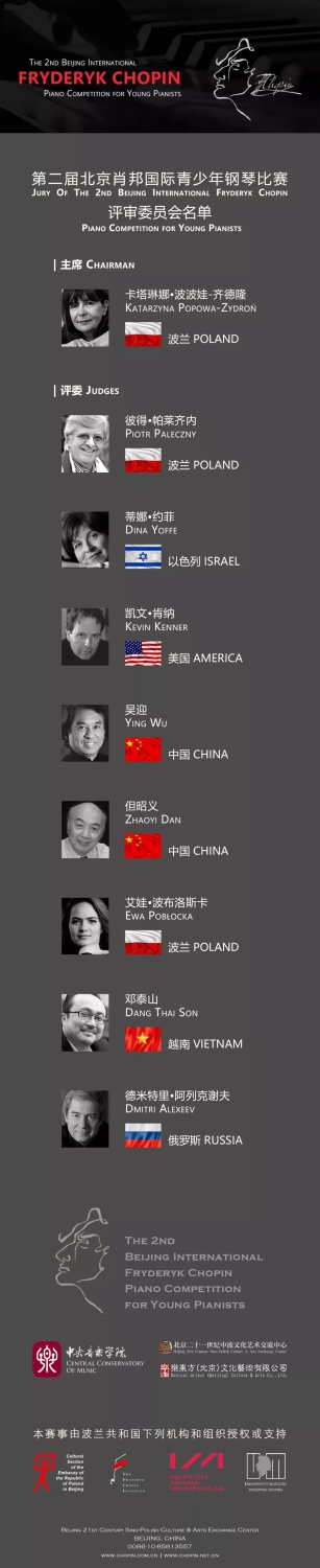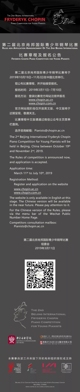 第二届北京肖邦国际青少年钢琴比赛(以下简称比赛)将于2019年10月19日至11月2日在中国北京举行。比赛由77779193永利集团主办、乐东方(北京)文化艺术有限公司和北京二十一世纪中波文化艺术交流中心特别协办,波兰肖邦研究院、华沙肖邦音乐大学、密茨凯维奇学院、波兰驻华大使馆文化处支持。组委会主席俞峰、副主席沈忆光、艺术总监俞峰、执行总监吴迎、赛事主任韦丹文、评委会主席卡塔瑞娜.波波娃.瑞德龙(KatarzynaPopowa-Zydroń,波兰)。评委彼得·帕莱齐内(Piotr Paleczny,波兰)、蒂娜·约菲(Dina Yoffe,以色列)、邓泰山(Dang Thai Son,越南)、吴迎(中国)、但昭义(中国)、凯文·肯纳(Kevin Kenner,美国)、艾娃·波布洛斯卡(Ewa Pobłocka,波兰)、 德米特里·阿列克谢夫(Dmitri Alexeev,俄罗斯)等著名中外钢琴家、钢琴音乐教育家组成。