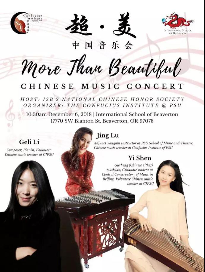 2018年12月6日上午,比佛顿国际学校 (International School of Beaverton) 举办了“超∙美(More Than Beautiful)”中国音乐会。该活动由校中文荣誉协会(National Chinese Honor Society)主办,旨在激发学生中文学习兴趣,分享中国音乐,浓厚校园多元文化氛围,三位中国音乐教师为学校120余名师生送上了优美的中国旋律。