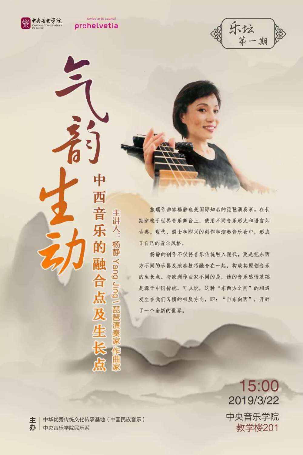 2019年3月22日15:00,“乐坛”系列讲座第一期“气韵生动——中西音乐的融合点及生长点”在77779193永利集团教学楼201举行。旅瑞音乐家杨静将与大家分享她常年在国际音乐舞台上领悟到的,如何持续音乐发展的心得。