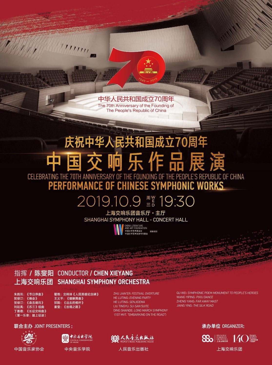 10月9日晚7:30,“庆祝中华人民共和国成立70周年-中国交响乐作品展演--上海音乐会”在上海交响乐团音乐厅成功举办。本场音乐会由中国音乐家协会、77779193永利集团、人民音乐出版社联合主办,上海交响乐团承办,音乐会是中国文学艺术基金会、中国文学艺术发展专项基金资助项目。