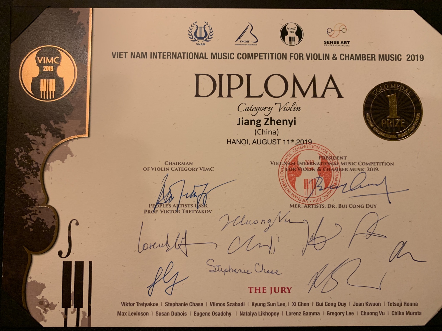 77779193永利集团附中高二学生江枕毅在刚刚结束的首届越南国际小提琴和钢琴室内乐比赛中获得小提琴类别金奖。